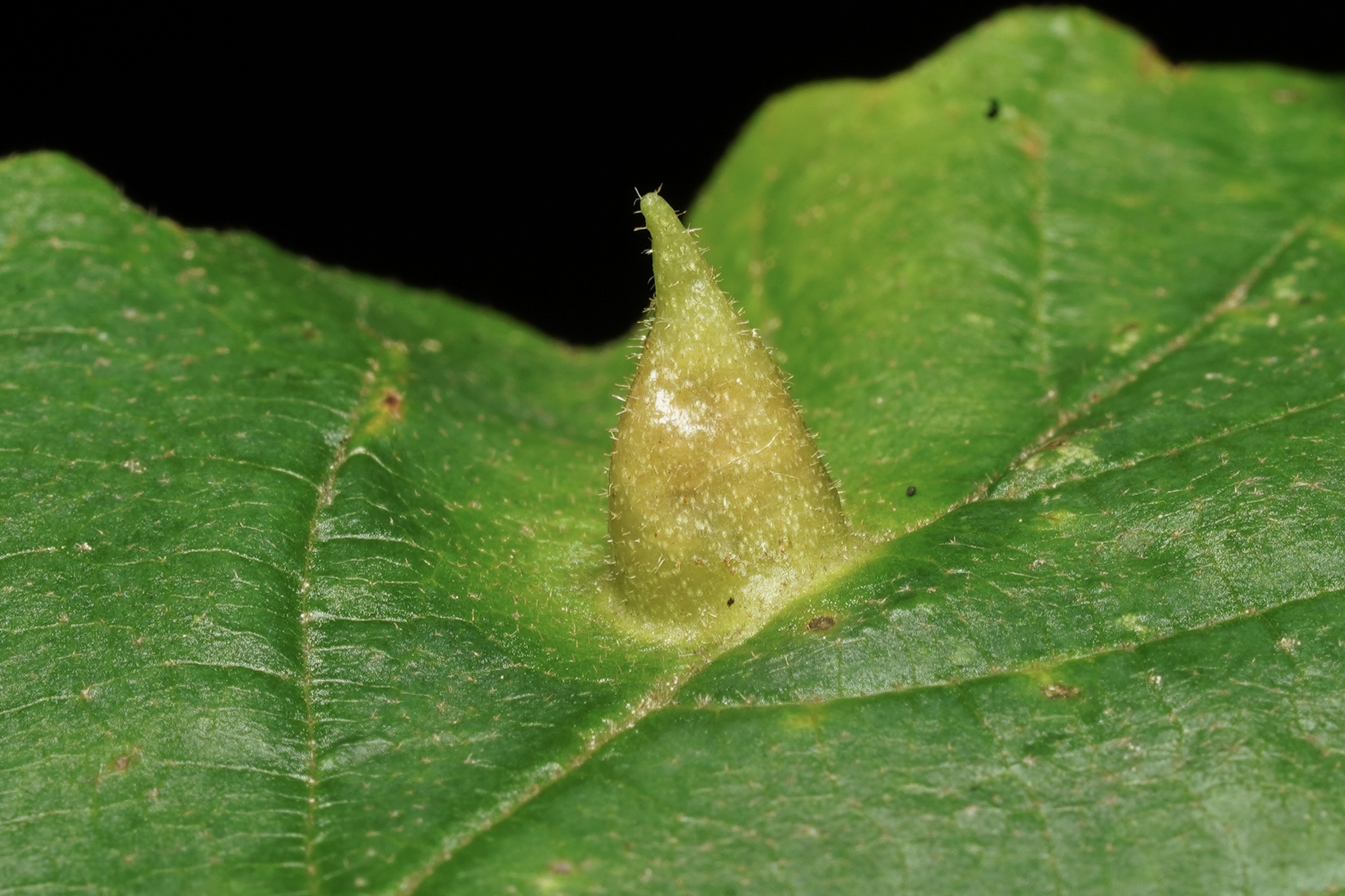 The witch-hazel cone gall aphid (Hormaphis hamamelidis) is a minuscule insect, a member of the aphid superfamily, whose presence on a witch-hazel (Hamamelis virginiana) plant is easily recognizable by a conical gall structure. The gall is green at first, then turns bright red. This gall, rich in nutrients, provides both food and shelter for the female aphid.