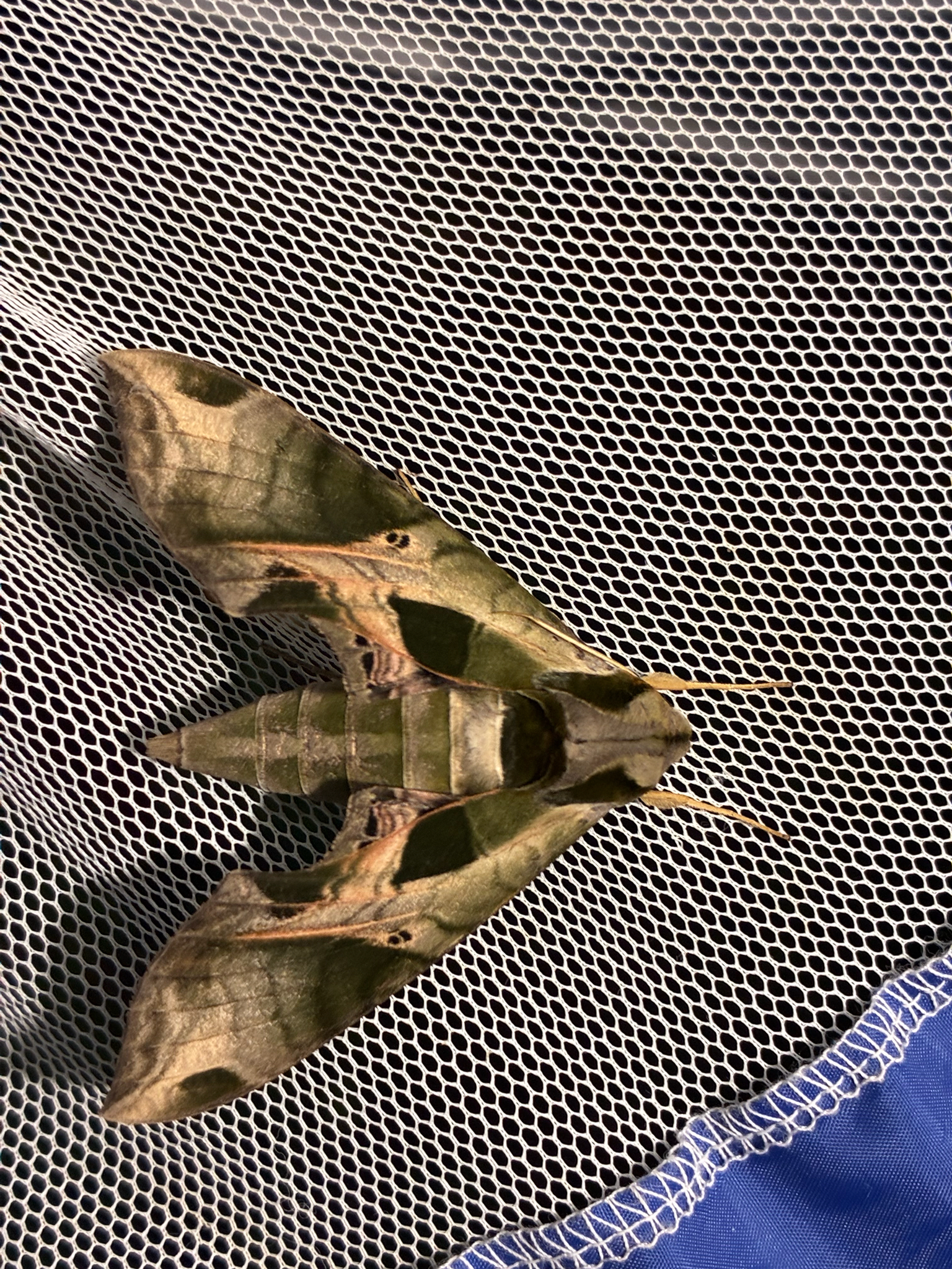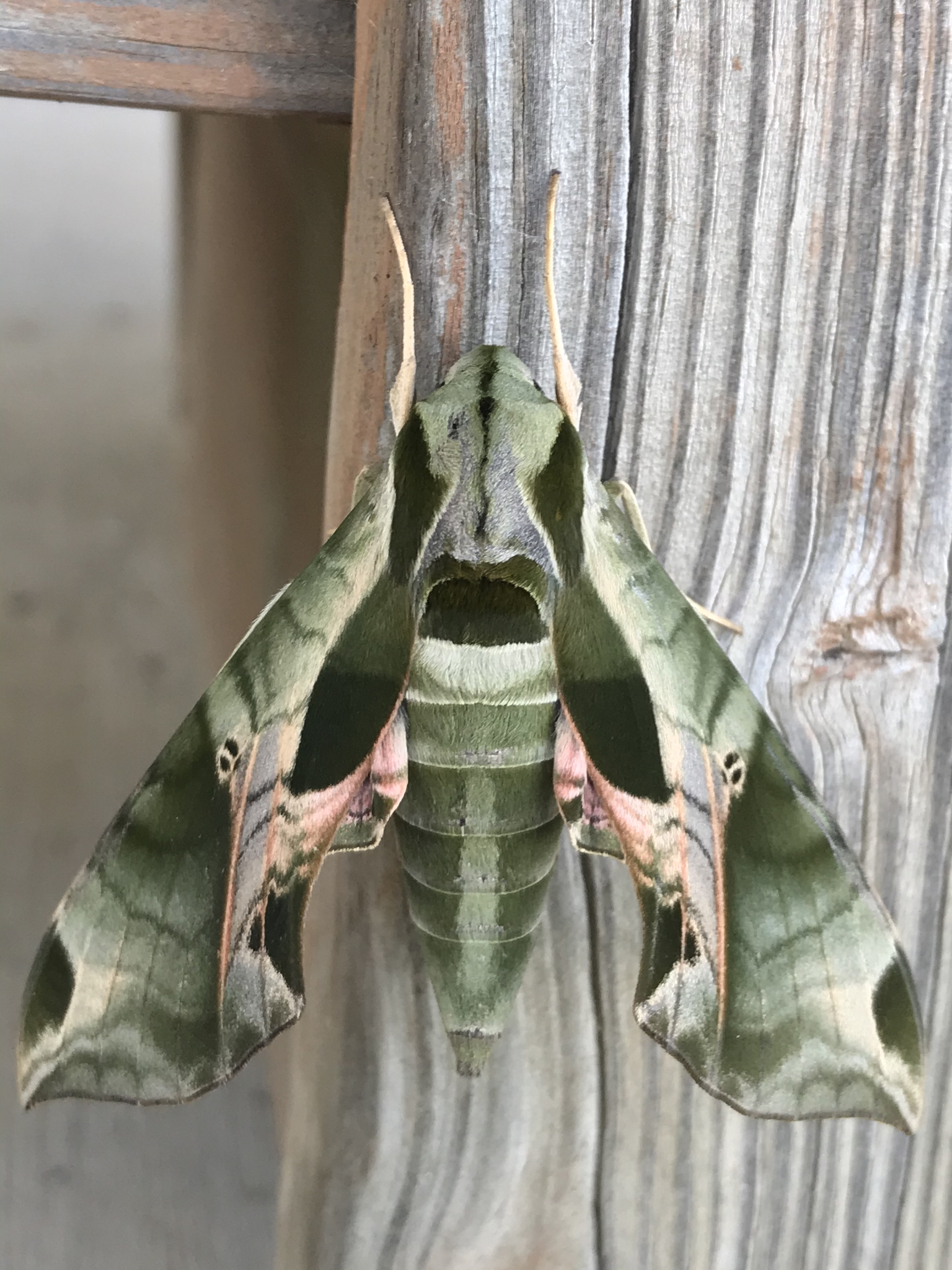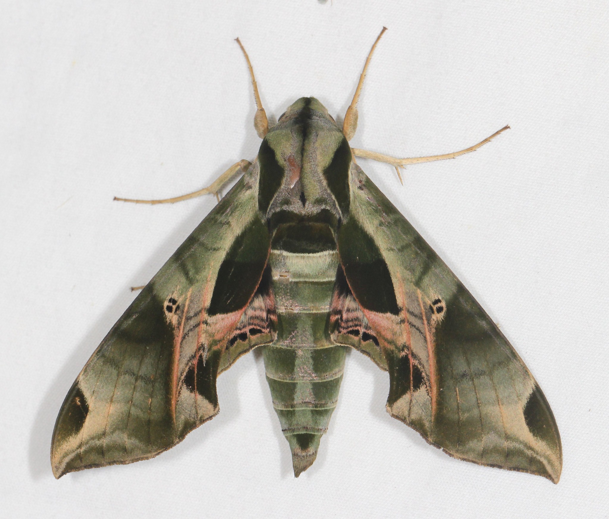 [edit]The pandora sphinx moth has a wingspan of 3.25–4.6 inches (8.3–11.7 cm).[2][3] Its wings are opaque and have a greenish-olive background on the dorsal surfaces.[4] The wings are narrow[4] and are held deltaform at rest. Females generally have a larger abdomen than males. There are green markings on the dorsal forewing[4] with a two-toned double spot extending from the base along the forewing's inner margin.[5] When the wings are folded, the latter spot aligns with a dark mark on the moth's body that covers each tegula.[6] A green marking with a pale outline is visible near the apex of the forewing.[6] The dorsal surfaces of the hindwings, when extended, reveal black patches[4] on a white background that becomes greenish-olive near the termens.[6] Pink is present around the torni of the hindwings and in isolated areas on the dorsal forewings.[5] Small dark eyespots on the hindwings and the forewings, there found in the discal position bearing two tiny "pupils," are visible even when the wings are folded.[2][5] The ventral surfaces of the wings are a pale shade of yellow-green or brown.[6]