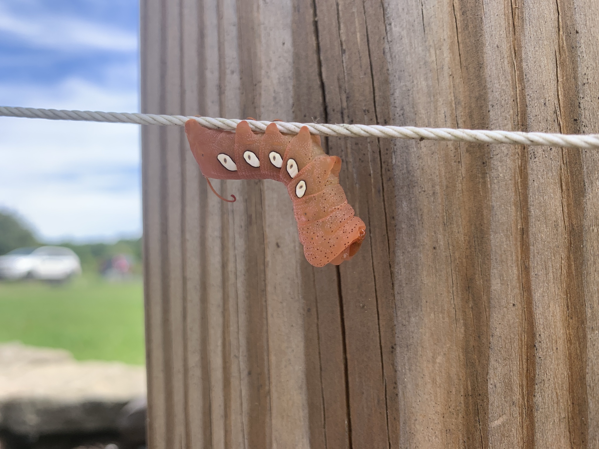 Caterpillars grow up to 9 centimetres (3.5 in) and are green in the first instar, but may be one of a variety of colors in later instars, including green or brownish-red.[7][8] The head and first two thoracic segments can be retracted into the third segment.[8] The abdomen has a small spot on the second segment and big white oval spots overlying the last five spiracles.[8] They also have the characteristic "horn" of the Sphingidae hornworms with its base on an eyespot at the end of their abdomen, although only the raised eyespot is present in the last larval instar.[8]