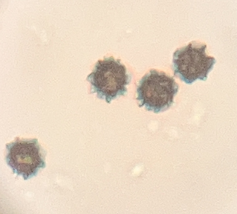 Spores of Lactarius subplinthogalus in Howard Co., Maryland (8/24/2018). Round, warted; measured 7.2-8.4 microns.
