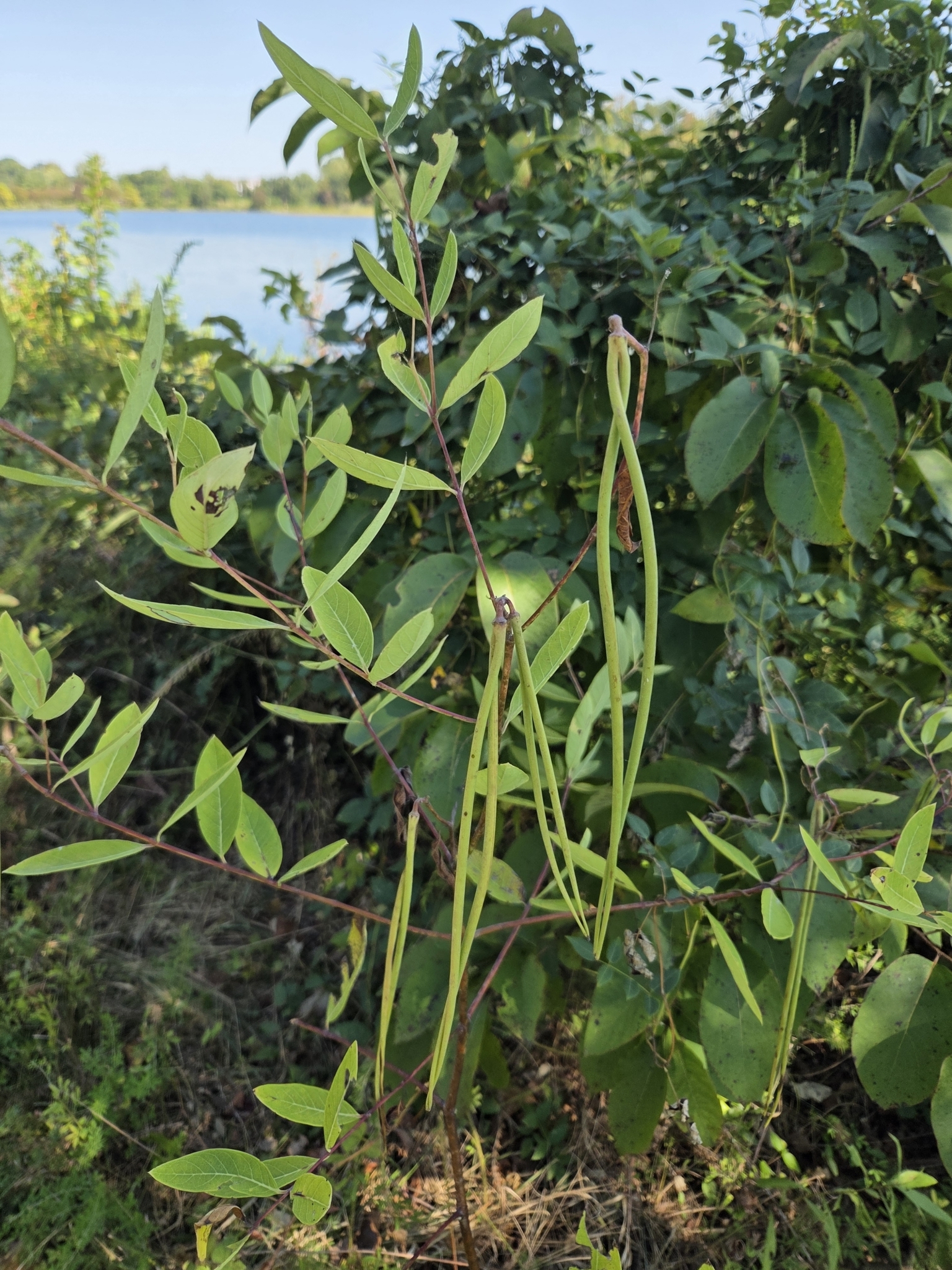 Apocynum cannabinum (dogbane, amy root, hemp dogbane, prairie dogbane, Indian hemp, hemp dogsbane, rheumatism root, dogsbane, or wild cotton)[4] is a perennial herbaceous plant that grows throughout much of North America—in the southern half of Canada and throughout the United States. It is poisonous to humans, dogs, cats, and horses. All parts of the plant contain toxic cardiac glycosides that can cause potentially fatal cardiac arrhythmias if ingested. Some Lepidoptera can withstand the toxins and feed on this plant.