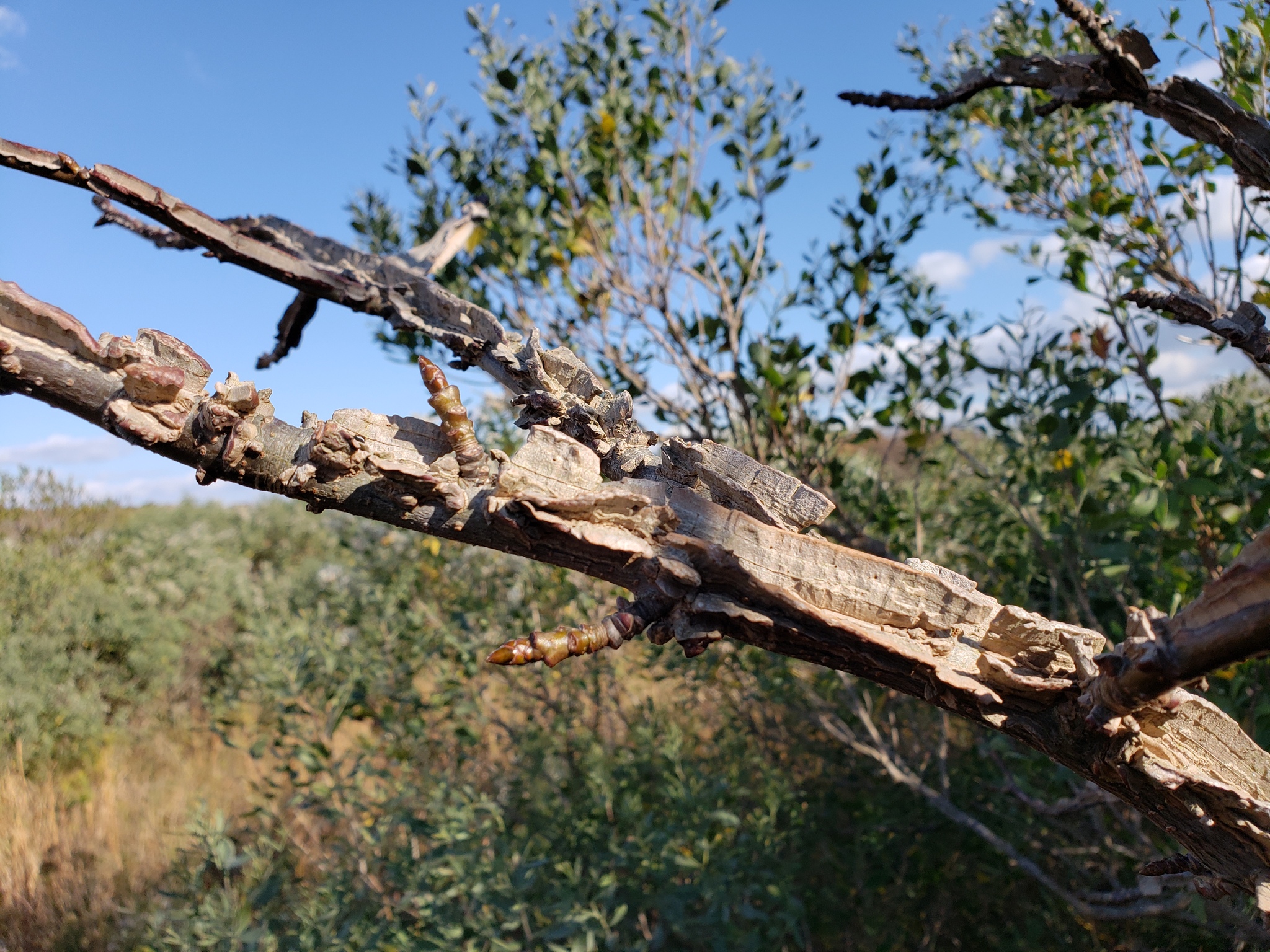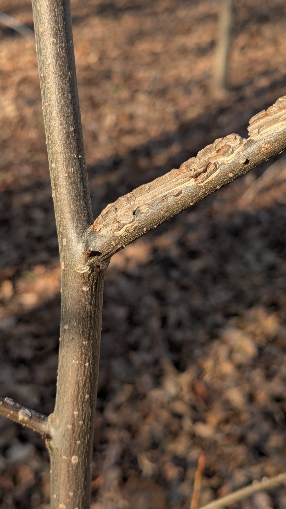 [edit]The bark attaches itself to these in plates edgewise instead of laterally, and a piece of the leafless branch with the aid of a little imagination readily takes on a reptilian form; indeed, the tree is sometimes called "alligatorwood".[14] The bark is a light brown tinged with red and sometimes gray with dark streaks and has a density of 590 kg/m3 (37 lb/cu ft).[16] It is deeply fissured with scaly ridges.[14] The branches carry layers of cork.[18] The branchlets are pithy, many-angled, winged, and at first covered with rusty hairs, finally becoming red brown, gray or dark brown.[14] As an ornamental tree, the species has a drawback—the branches may have ridges or "wings" that cause more surface area, increasing weight of snow and ice accumulation on the tree. However, the wood is heavy and hard with an interlocking grain,[9] but is difficult to season.[19]