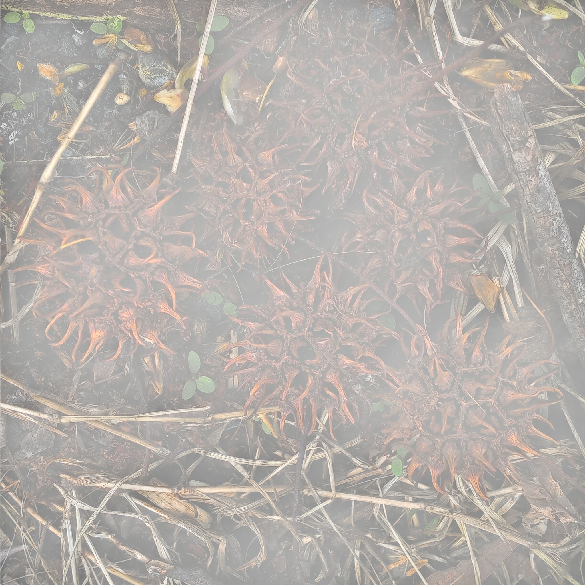 The fungus Sweet Gum Fruit Fungus (Xylaria liquidambaris) can be found on dropped, decaying Sweet Gum fruit.