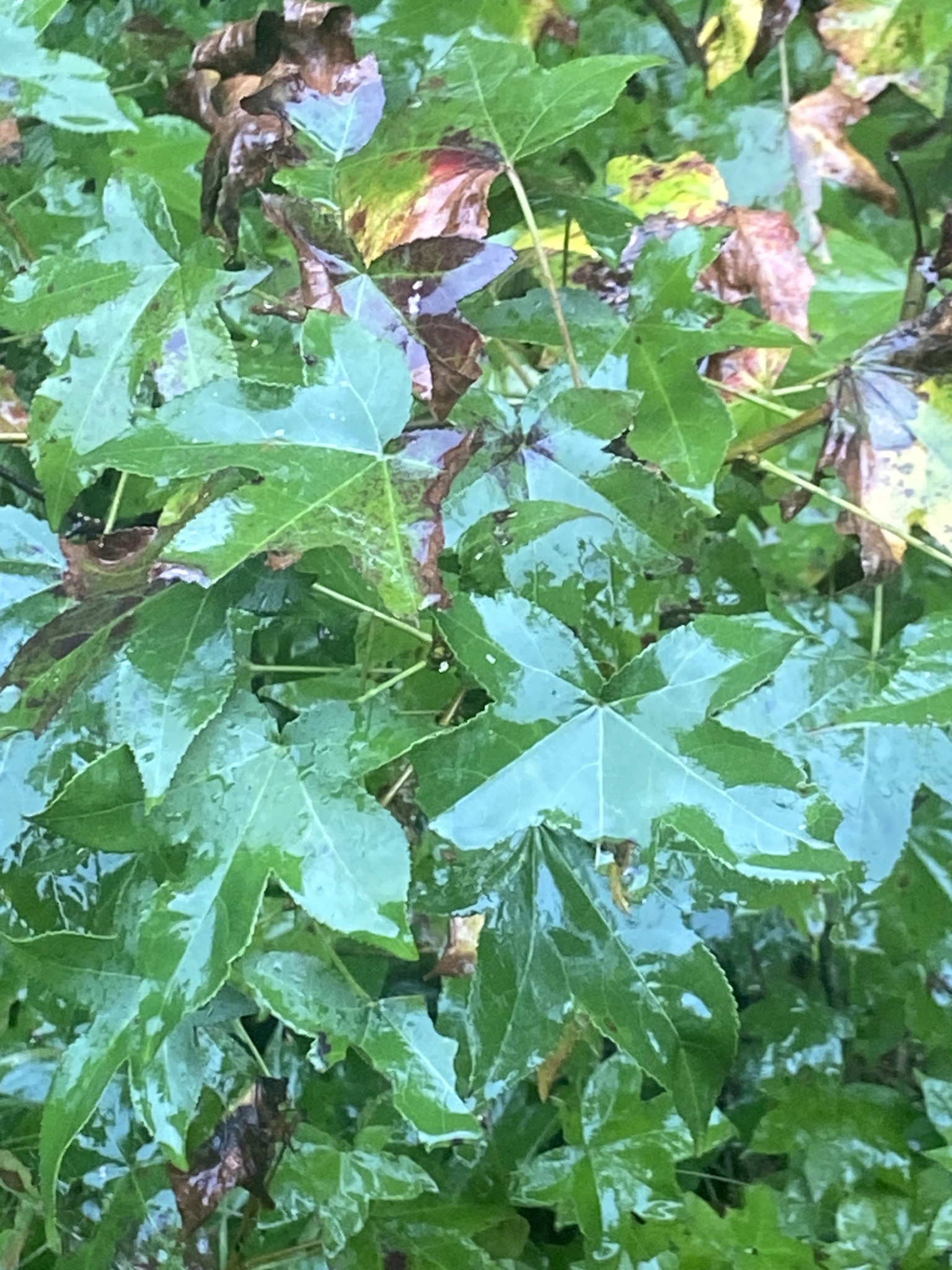 They are long and broad, with a 6–10 cm (2+1⁄4–4 in) petiole. The rich dark green, smooth, shiny, star-shaped leaves generally turn brilliant yellow, orange, red, and purple colors in the autumn.[9] Its reds and yellows compare to those of the maples (Acer), and in addition it has the dark purples and smoky browns of the ash (Fraxinus).[14] However, in the northern part of its range, and where planted in colder areas, the leaves are often killed by frost while still green. On the other hand, in the extreme southern or tropical parts of its range, some trees are evergreen or semi-evergreen, with negligible fall color. The base is truncate or slightly heart-shaped.[14] They contain tannin and when bruised give a resinous fragrance.[19]