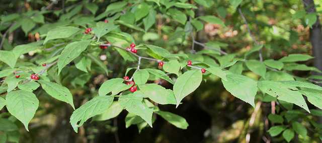 The flowers are 4–5 mm diameter, with a four-lobed white corolla, appearing in late spring when the leaves are more than half grown. The fruit is a spherical bright red drupe 8–10 mm diameter, containing four seeds.[4][5][6]