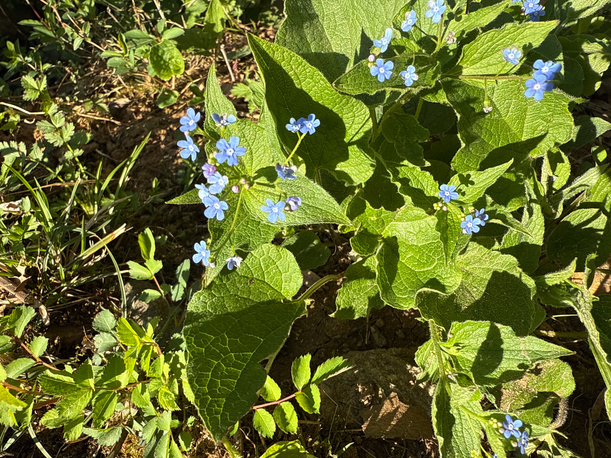 Brunnera macrophylla, the Siberian bugloss, great forget-me-not,[1] largeleaf brunnera[2] or heartleaf, is a species of flowering plant in the family Boraginaceae, native to the Caucasus. It is a hardy, rhizomatous, herbaceous perennial, that can reach from 12 to 18 inches (30 to 45 cm) in height, and carries basal, simple cordate leaves on slender stems. Sprays of small blue flowers, similar to those seen in the related forget-me-nots, are borne from mid-Spring,[3] and bloom for eight to ten weeks.[4]