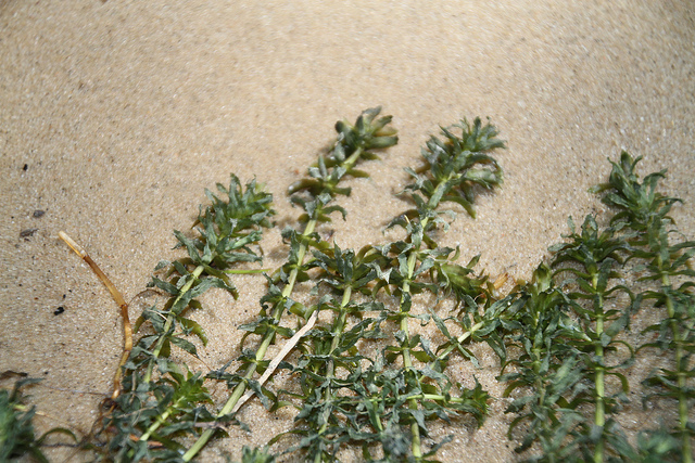 The stems grow up to 2 m long. The leaves are arranged in whorls of two to eight around the stem, each leaf 5–20 mm long and 0.7–2 mm broad, with serrations or small spines along the leaf margins; the leaf midrib is often reddish when fresh. It is monoecious (sometimes dioecious), with male and female flowers produced separately on a single plant; the flowers are small, with three sepals and three petals, the petals 3–5 mm long, transparent with red streaks. It reproduces primarily vegetatively by fragmentation and by rhizomes and turions (overwintering), and flowers are rarely seen.[3][5][6][7] They have air spaces to keep them upright.