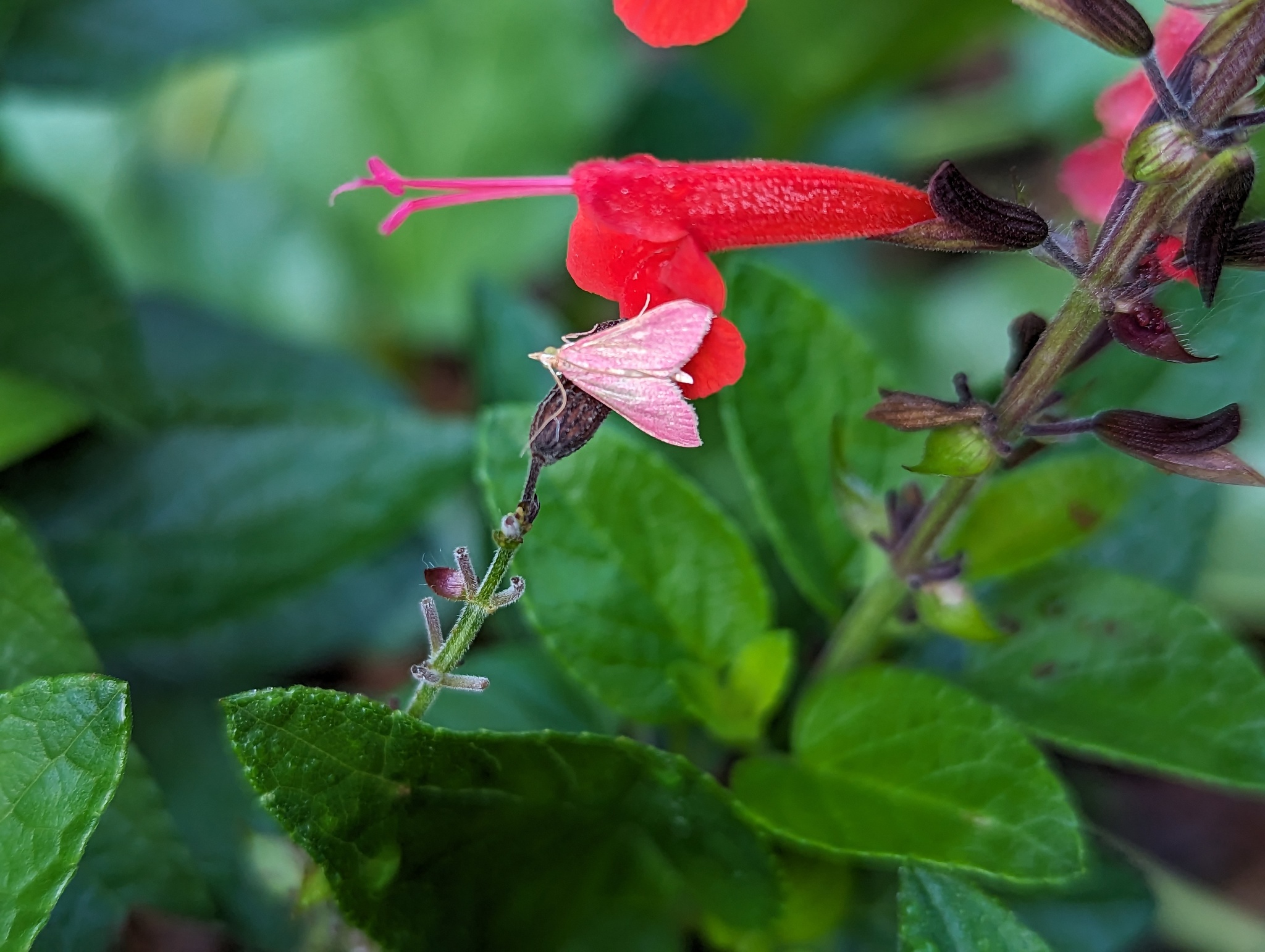 [edit]The larvae of this moth feed primarily on Salvia species, including Salvia farinacea.[11] They mainly feed on the flowers and buds of salvia species by boring into the unopened flowers near the base. Basil is a suspected possible alternative host plant for the larvae as well.[12][13]