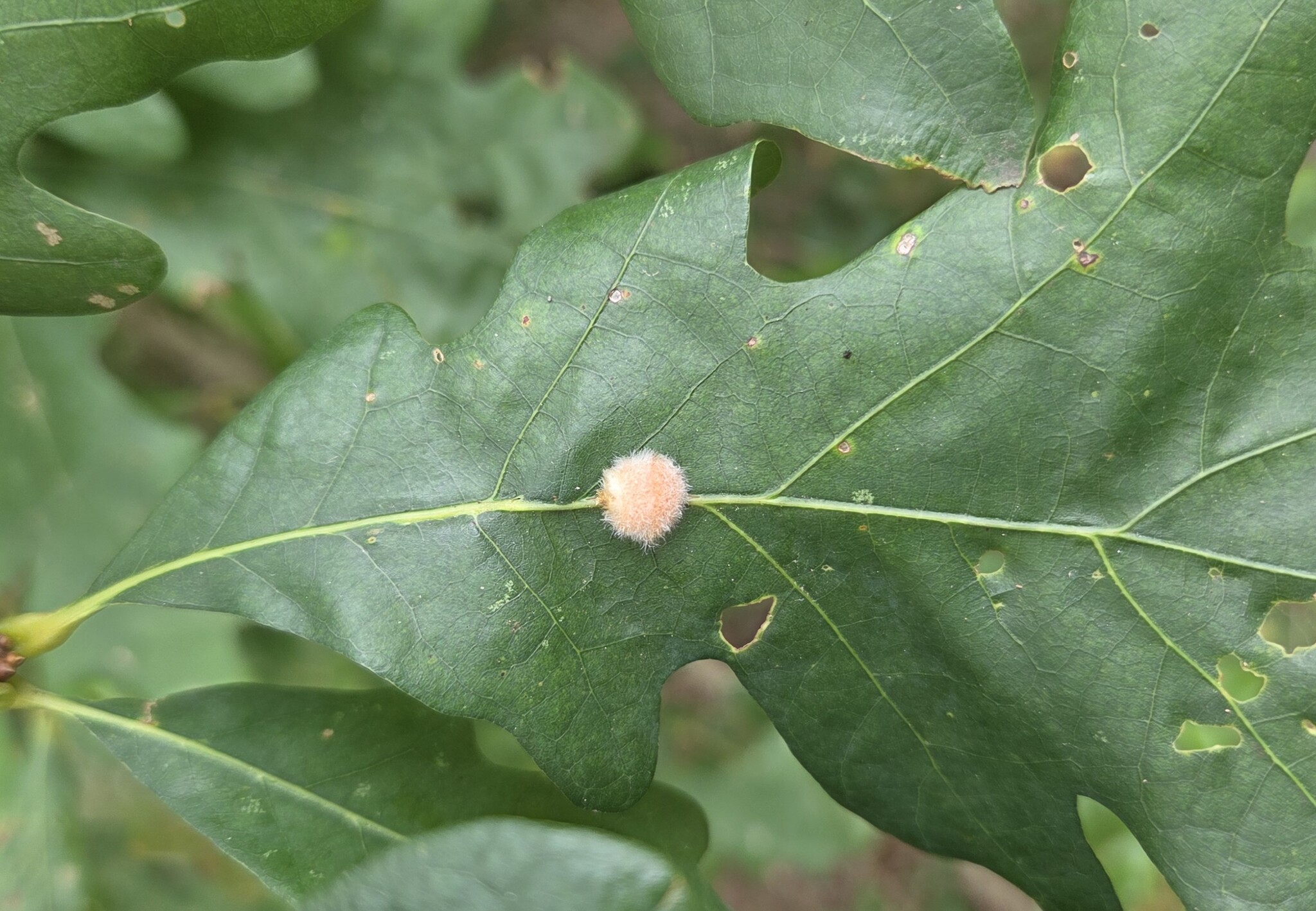 "Forms galls on leaves of white (Quercus alba) and chestnut (Q. prinus) oaks. Galls fall with the leaves and remain on them over winter" (BugGuide, 2016).