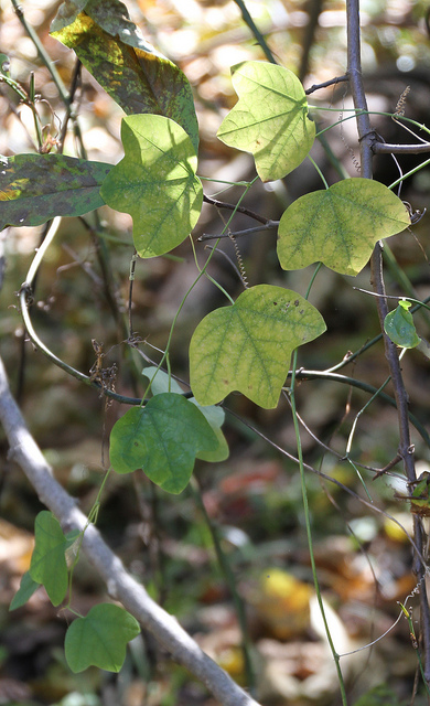 [edit]P. lutea is a perennial, herbaceous, climbing or trailing, unbranched vine that can reach 3–5 m (10–16 ft) in length. Curled, springlike tendrils emerging from leaf axils help the vine to climb on structures or other vegetation. The leaves are trilobed, 3–7 cm (1–3 in) long and 3–15 cm (1–6 in) broad, with a 5 cm (2 in) petiole. Leaves have smooth (entire) margins and are alternate on the stem. The upper surface of the leaves is dark green, and may be mottled with splotches of lighter green.[2] In the north of its range, it is deciduous.