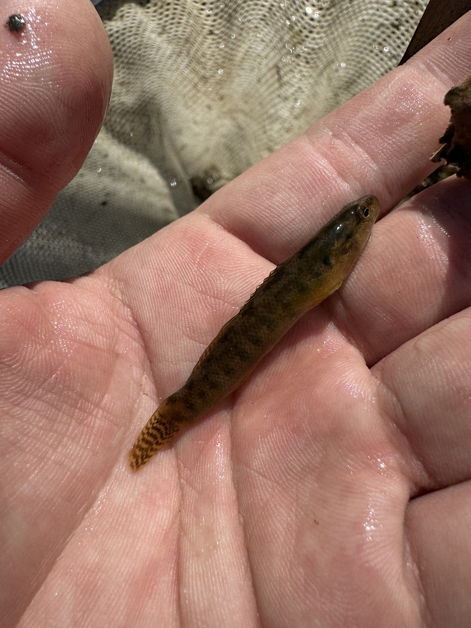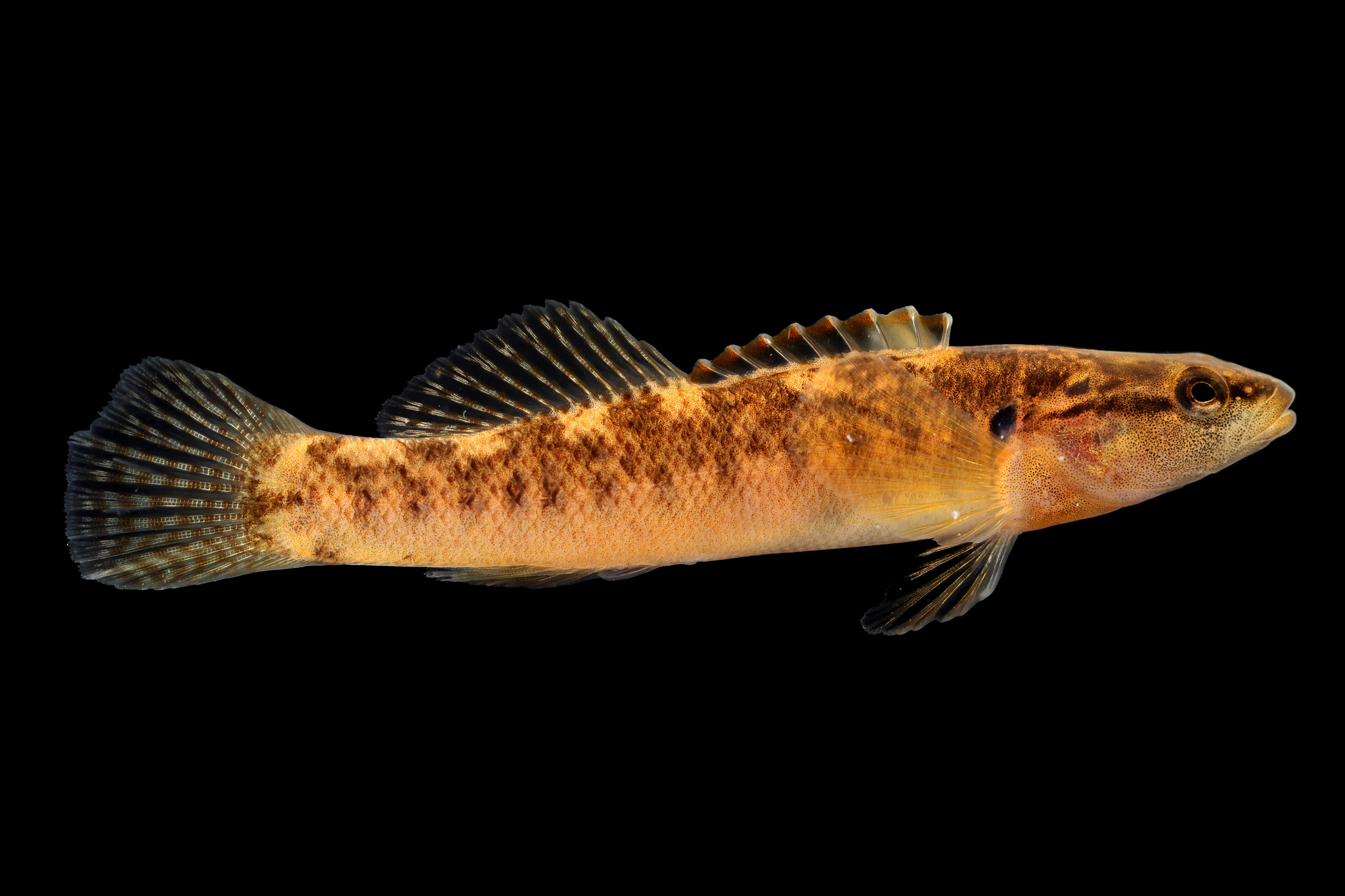 [edit]The fantail darter is a small, slender fish, typically reaching lengths of 1.5 to 3 inches. Its coloration ranges from olive-brown to tan, often featuring dark horizontal stripes or "pencil lines" along its sides. The species is characterized by a small head and a terminal mouth. A defining feature of the males is the presence of fleshy, gold-colored knobs on the tips of the spines of the first dorsal fin, which are used to mimic eggs during the breeding season. The tail fin is rounded and often displays several dark vertical bars.[3]