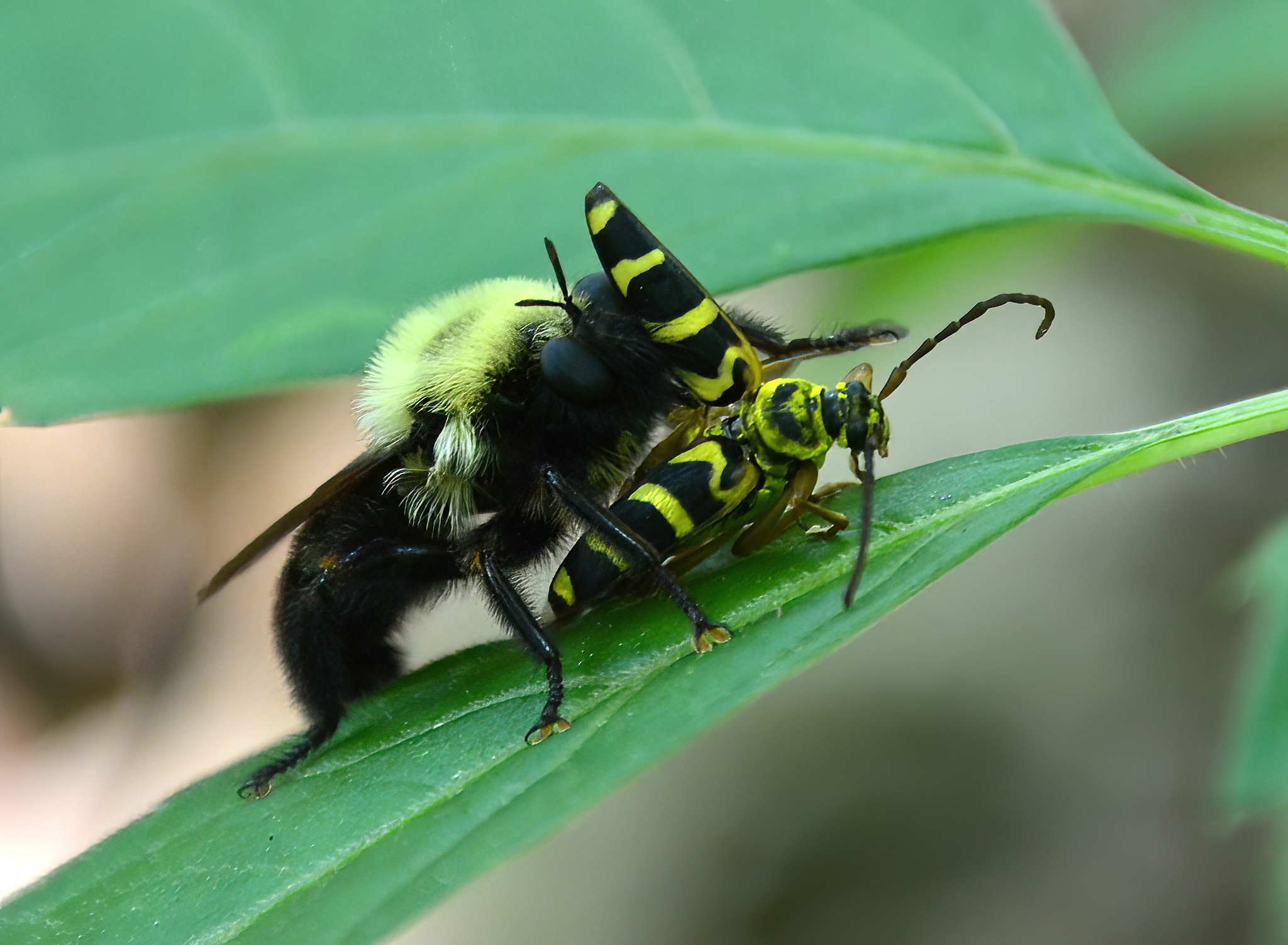 Laphria thoracica is one of the most common species of Laphria in this region. L. thoracica is quite widespread in deciduous forests, and can often be located haunting sunlit vegetation and edge habitats from mid-May to August. Territorial males wait for females on low plants near large rotting hardwood logs on the forest floor. The abdomen color varies from completely black to fully-banded with yellow on the base of the abdomen, with many intermediates between the two extremes. The different forms are likely mimetic of different species of Bombus, and the prevalence of a given form seems to vary regionally. This is one of the best bee mimics in the genus.