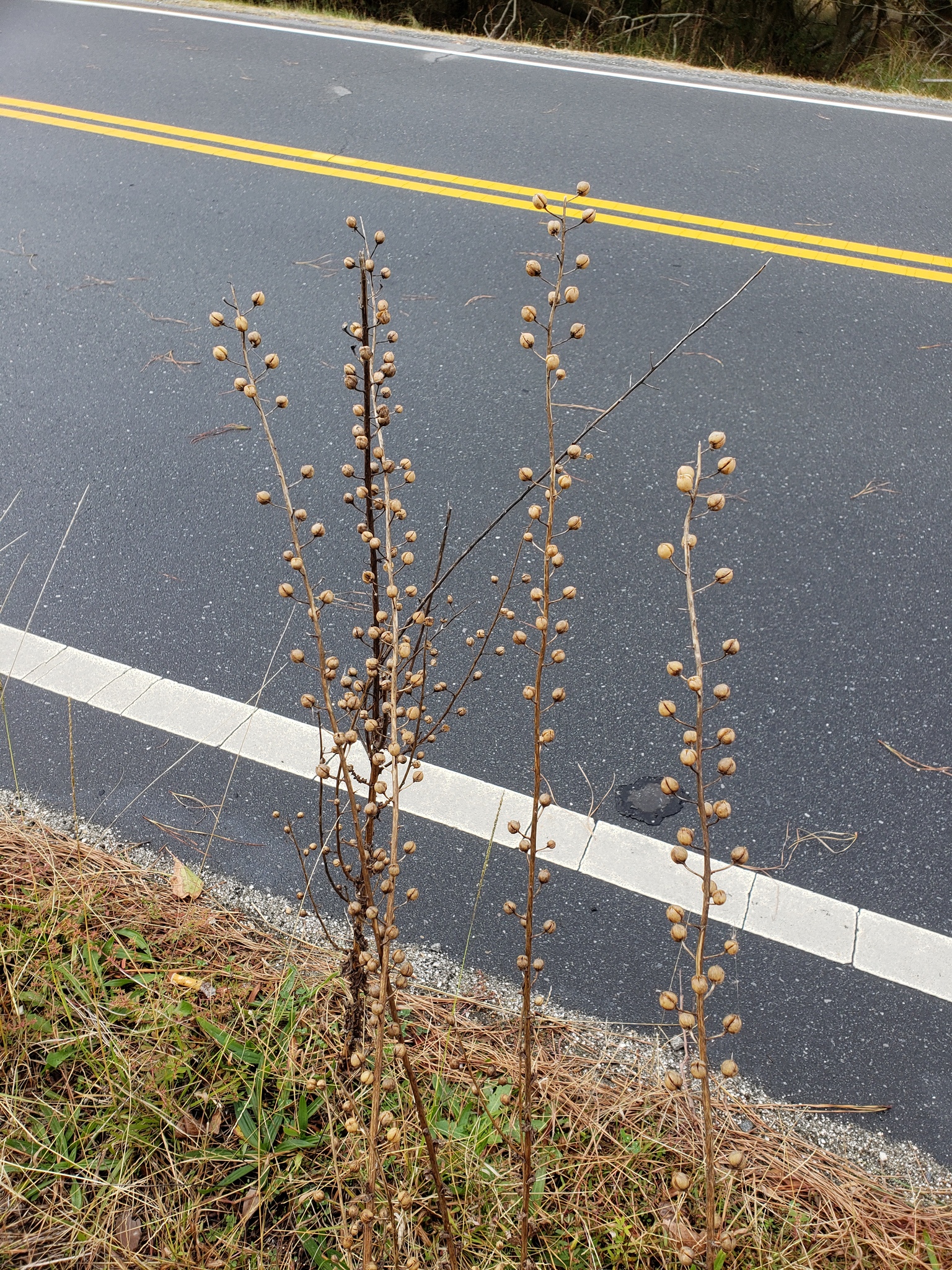 The moth mullein grows a small, simple fruit that is spherical in shape and has a diameter less than 0.5 inches (13 mm). Each fruit is dark brown in color and contains numerous dark brown seeds. The fruit of the mullein develops, matures, and falls from the plant all in the second year of growth. In certain regions of the world, finches have been known to consume and distribute the seeds.[7][10]