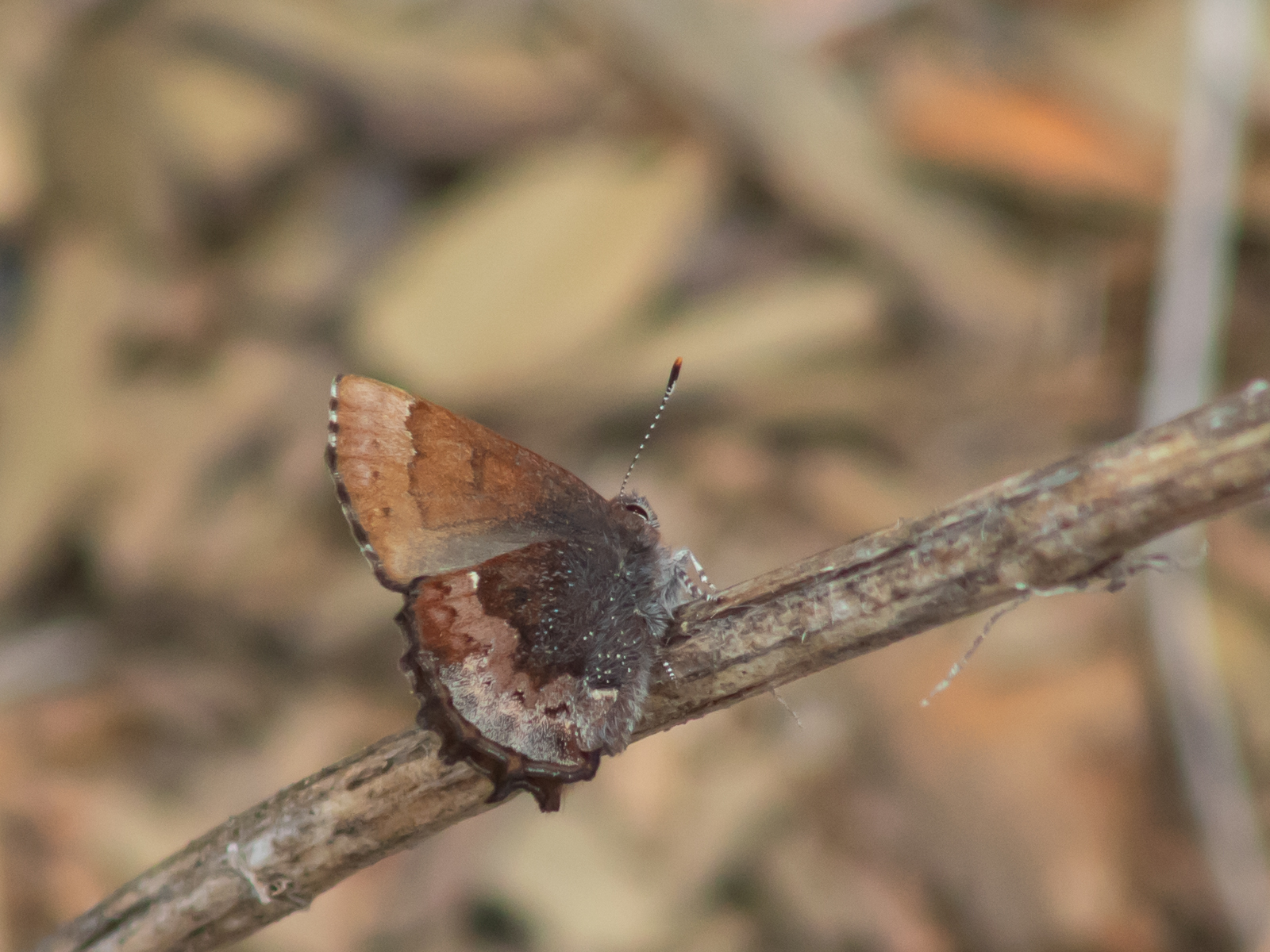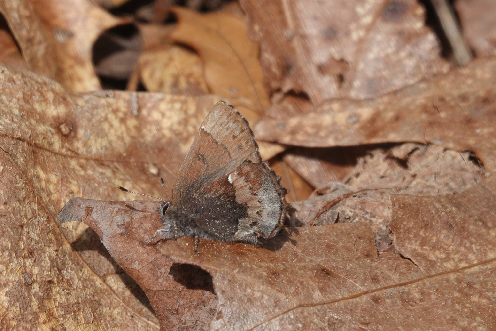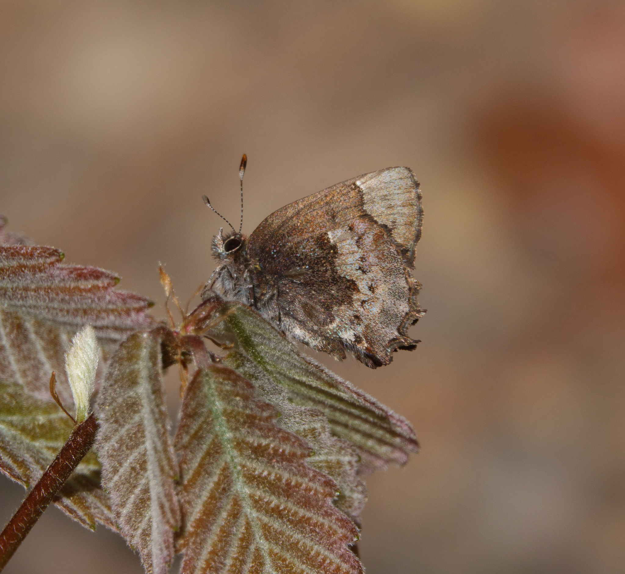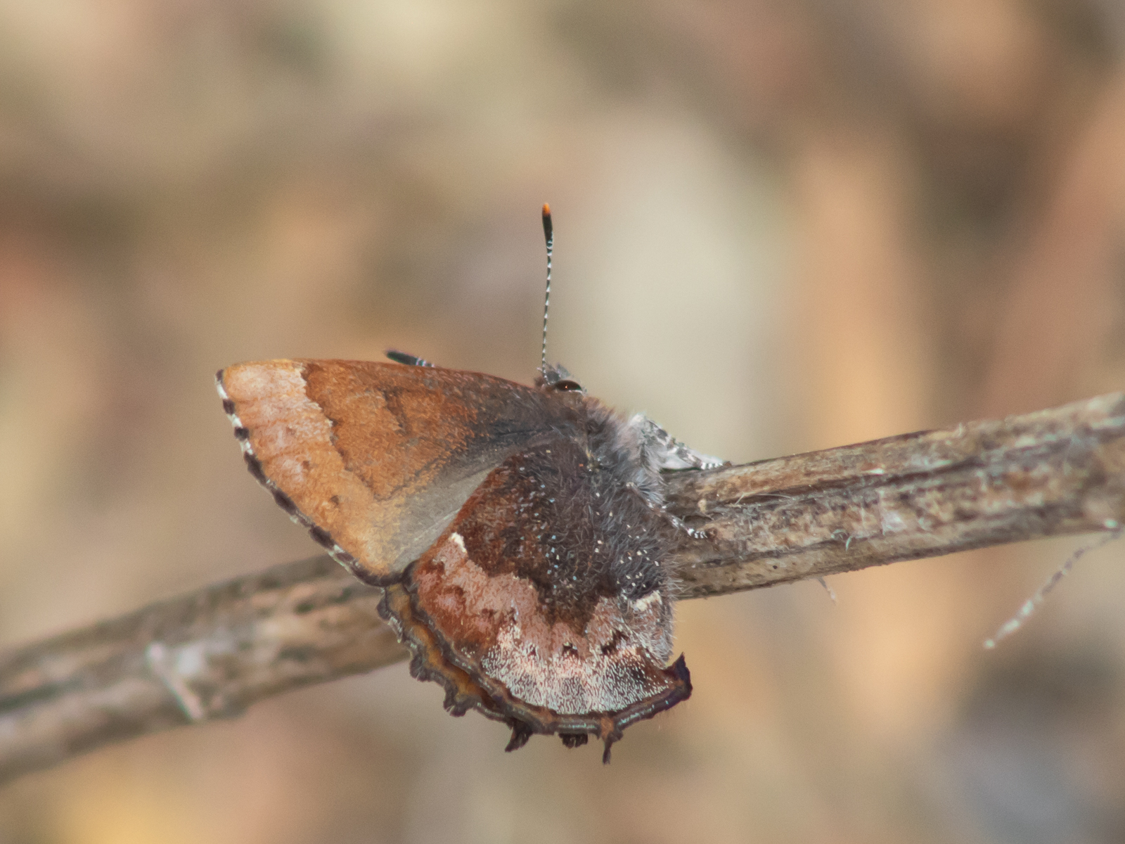 The brown elfin is more reddish brown, males have a stigma, it lacks hindwing tails, and the underside of the hindwing has no frosting.[4]