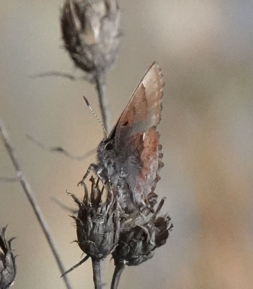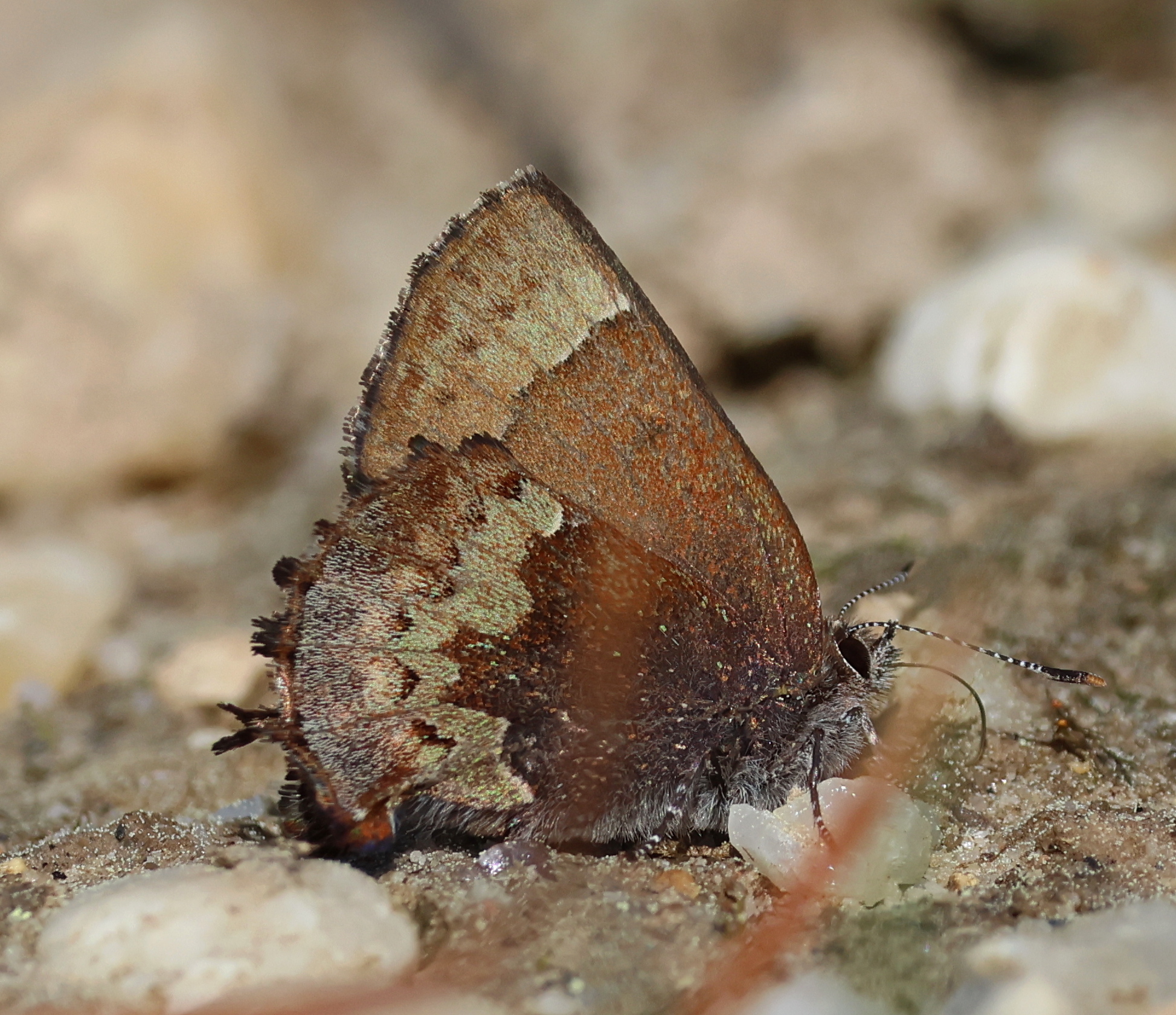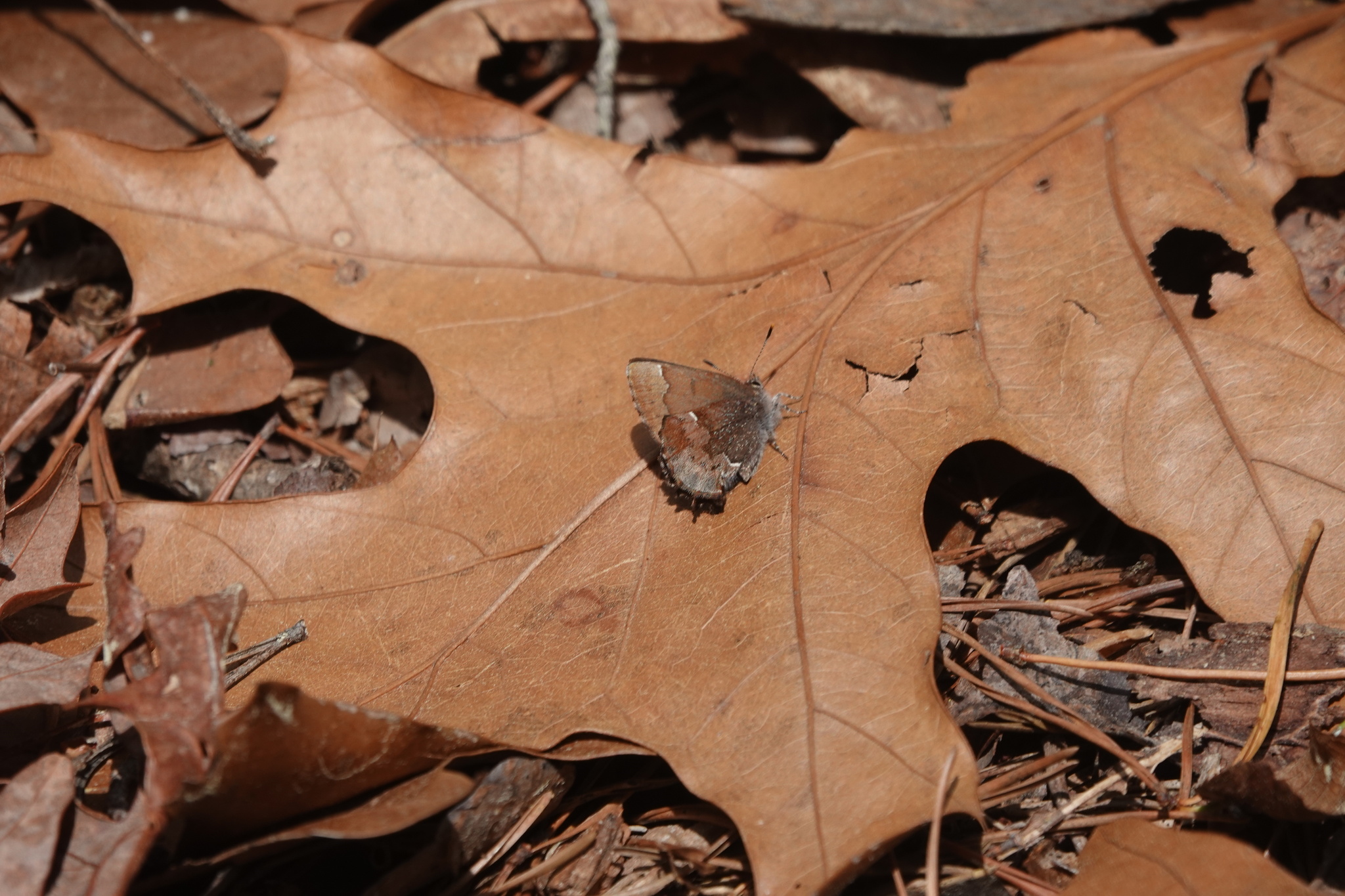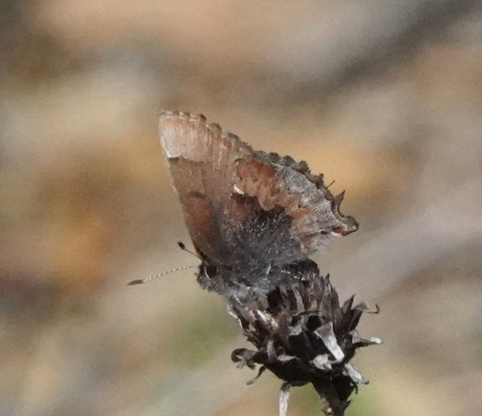 The brown elfin is more reddish brown, males have a stigma, it lacks hindwing tails, and the underside of the hindwing has no frosting.[4]