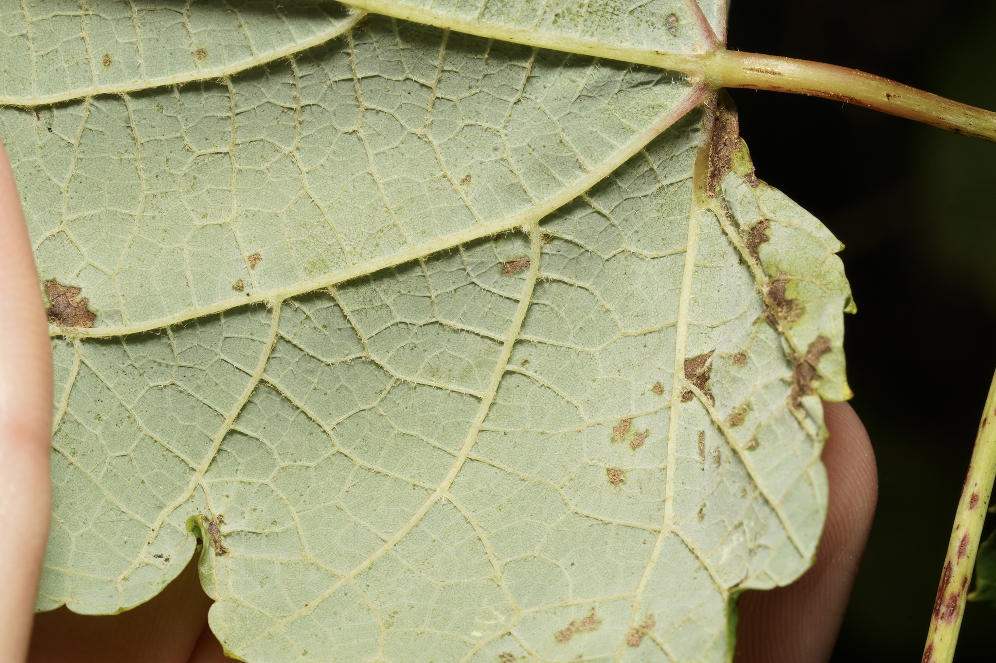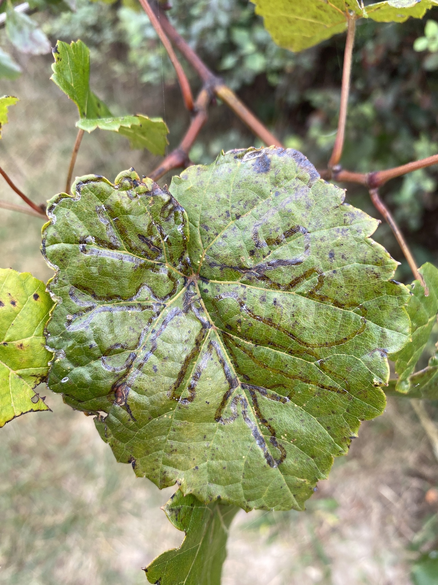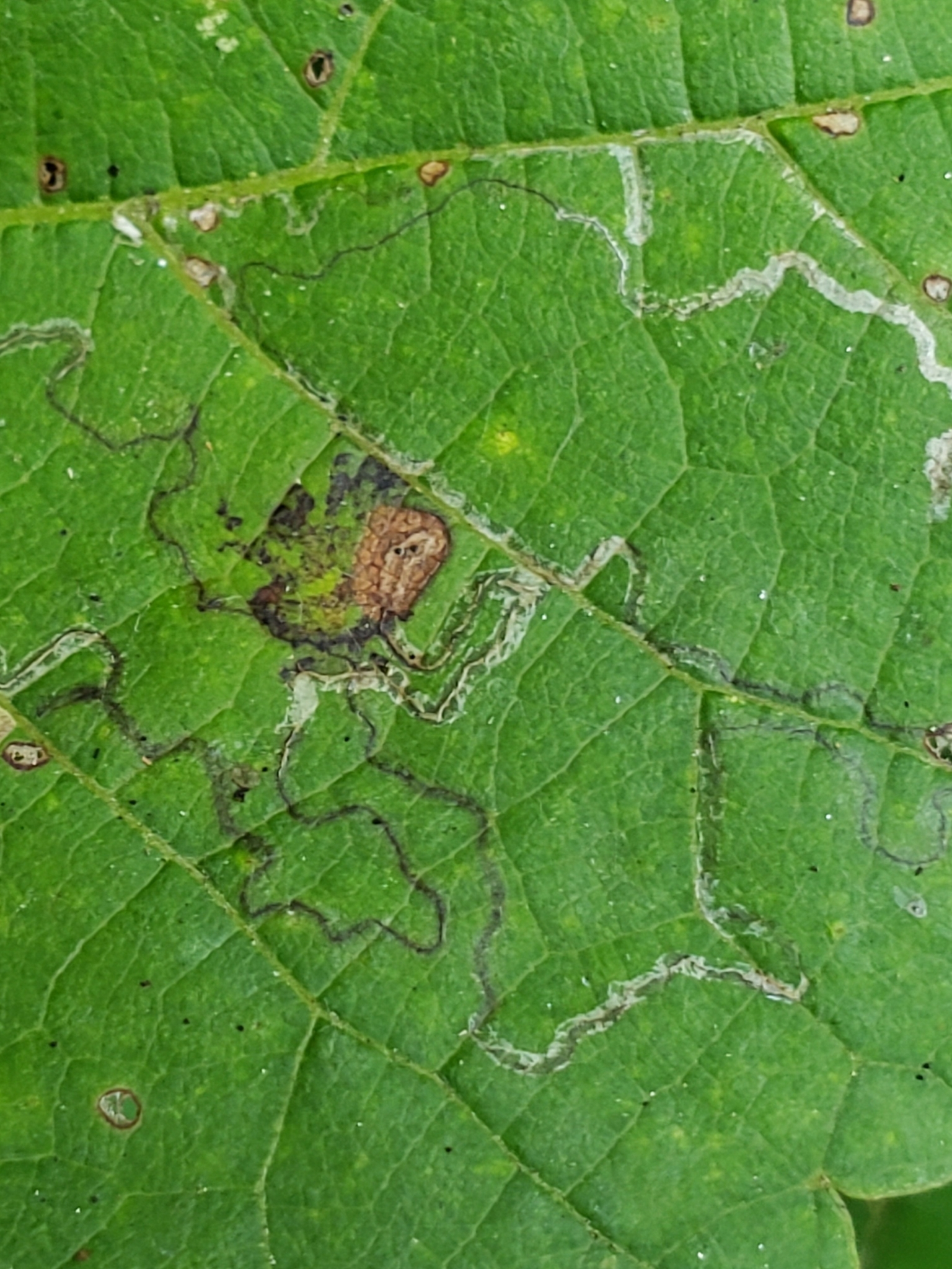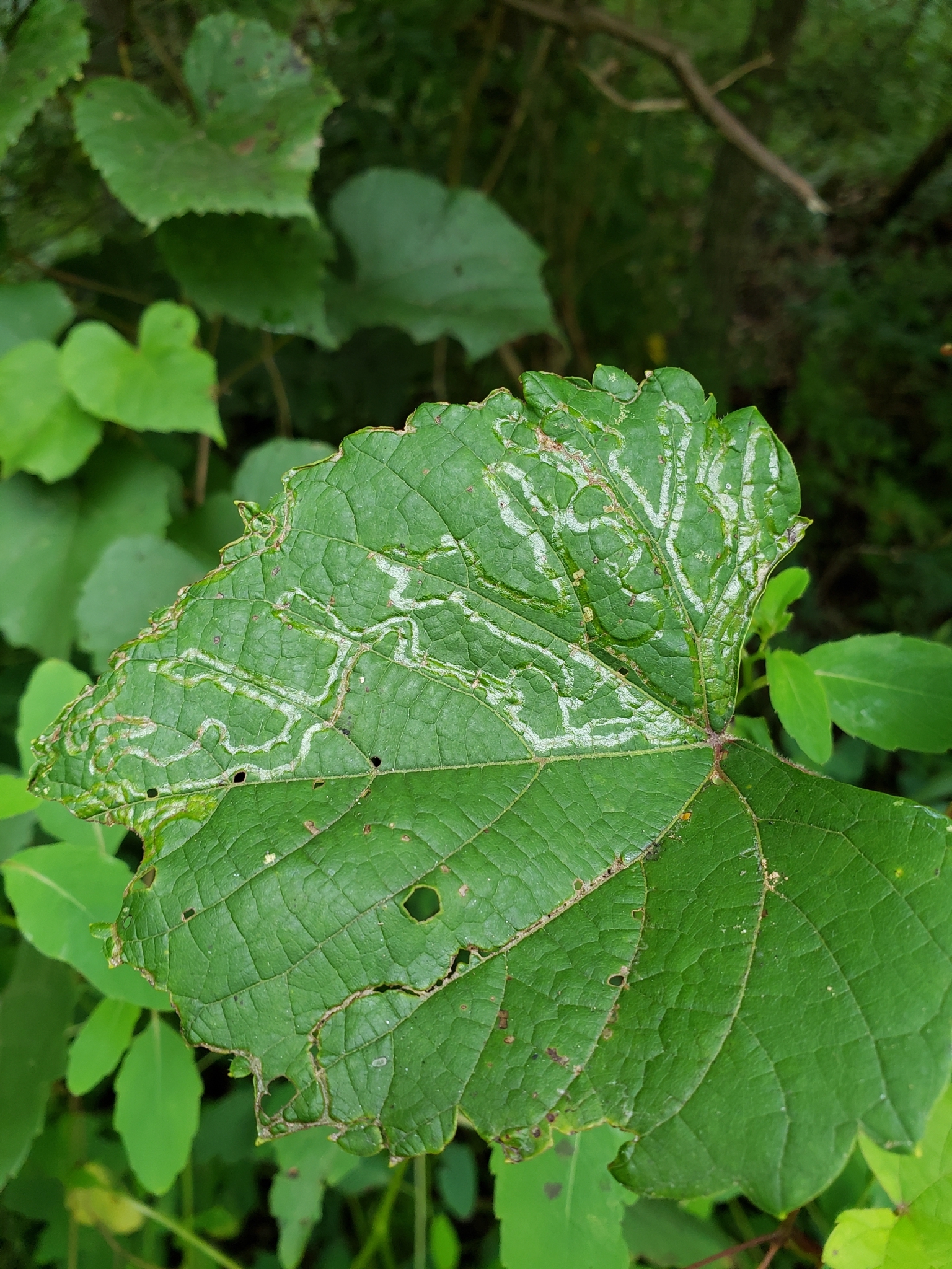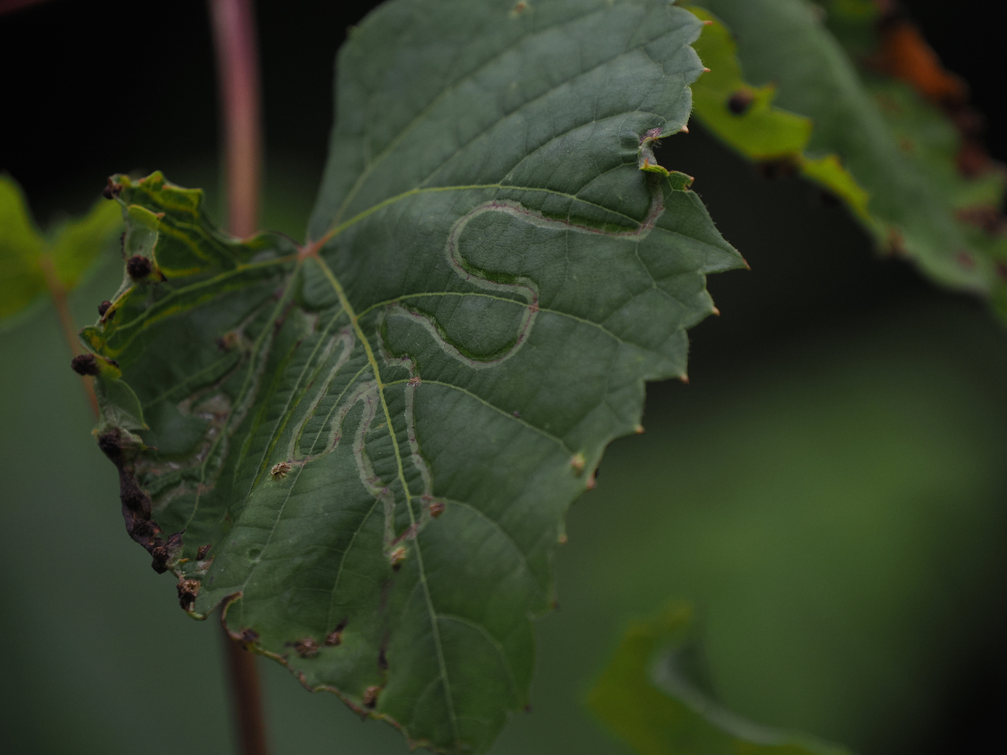 Phyllocnistis vitegenella leaf mines on grapevine in Harford Co., Maryland (9/30/2017).
