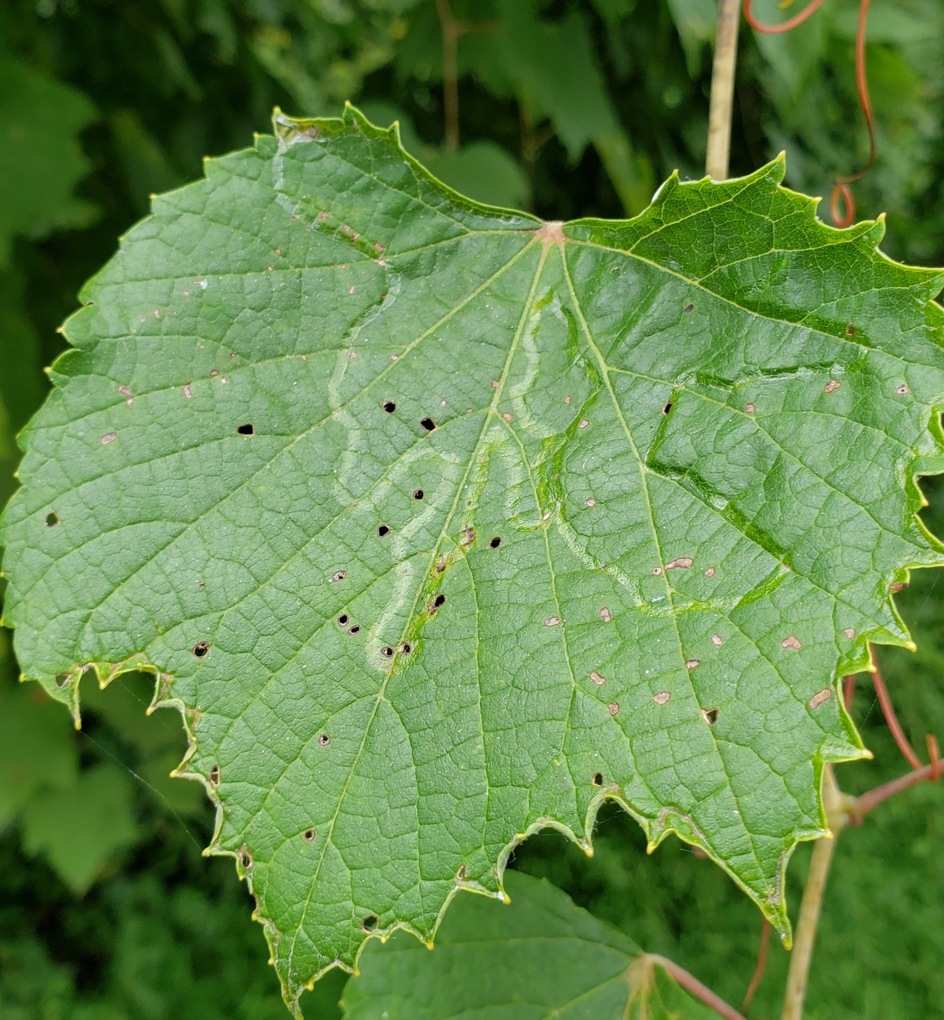 A Phyllocnistis vitegenella leaf mine in a grape leaf in Harford Co., Maryland (6/19/2018).