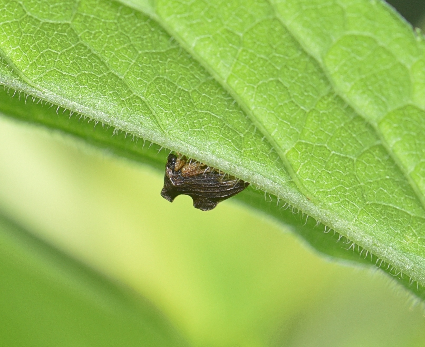 As adults, keeled treehoppers spend the winter months in leaf litter and debris, finally emerging in March.[5] They begin to reproduce and implant their eggs on aster leafs.[5] During this time of year plants produce vulnerable growth and soft tissues which make it an optimal time to embed their eggs.[5] Occasionally the laid eggs cause the leaf to fold over, forming a protected environment for the nymphs to develop in once they hatch.[5]