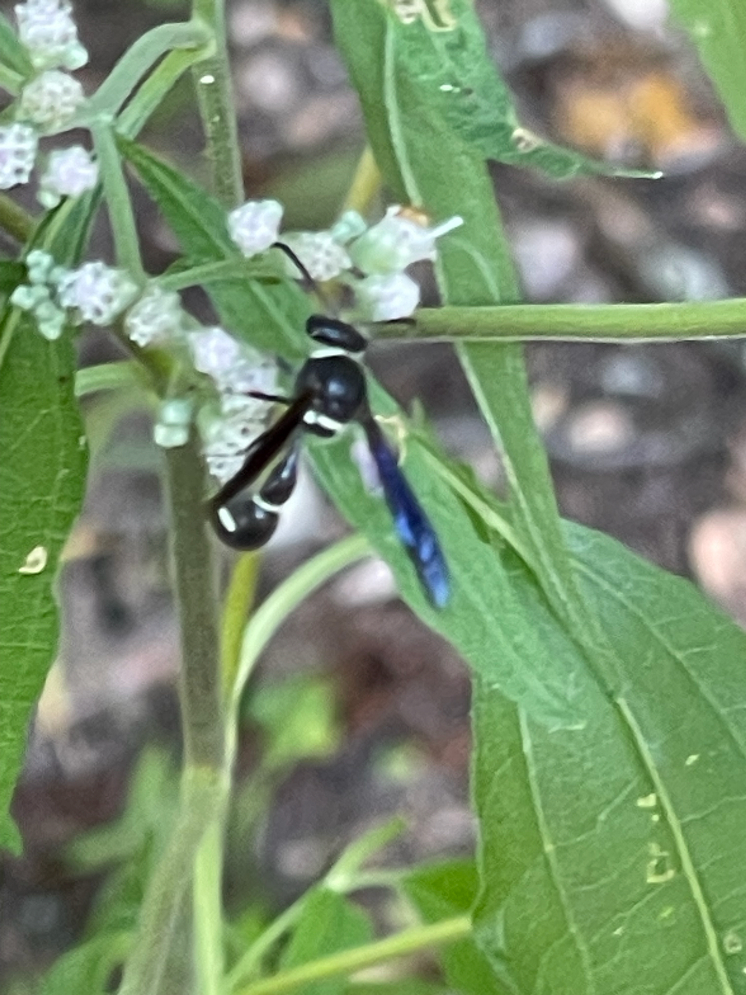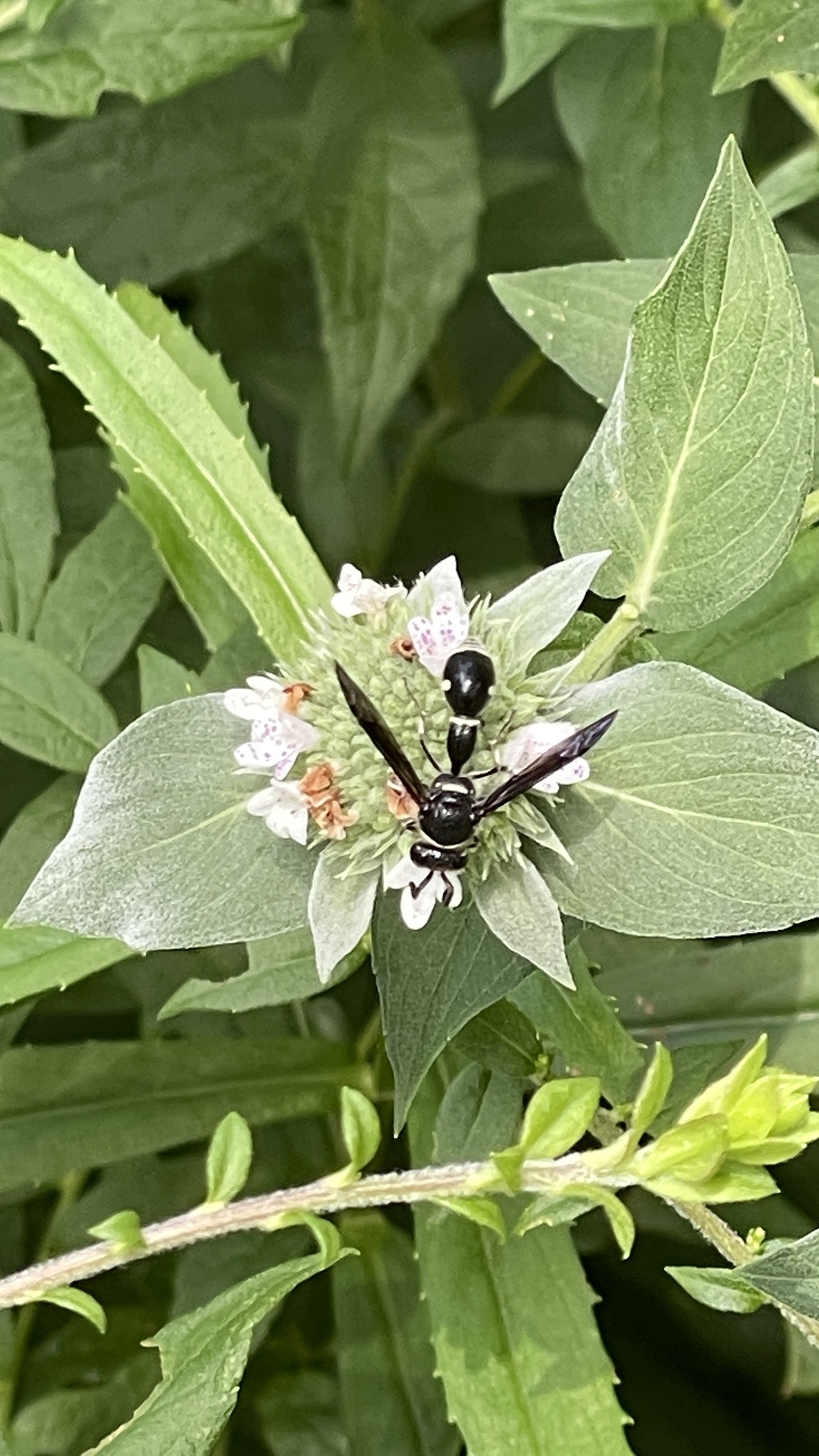 Eumenes fraternus is a species of potter wasp in the subfamily Eumeninae of the family Vespidae. It is native to the eastern United States and Canada. The female builds a miniature pot out of mud in which it lays an egg and places a live caterpillar. Its developing larva feeds on this whereas the adult wasp feeds primarily on nectar.