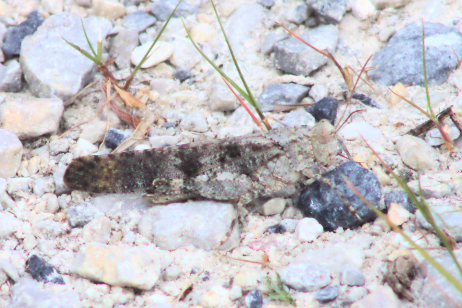 Carolina Locusts are often found on or around dirt roads or paths, where they can easily blend in to gravel and soil. They prefer dry, sunny, open areas for basking, courting displays, and egg laying.[9] Their courtship displays include flying and hovering above the open ground. These males can also call, but their sound is soft and quiet. Their flight is commonly confused for the flight of butterflies.