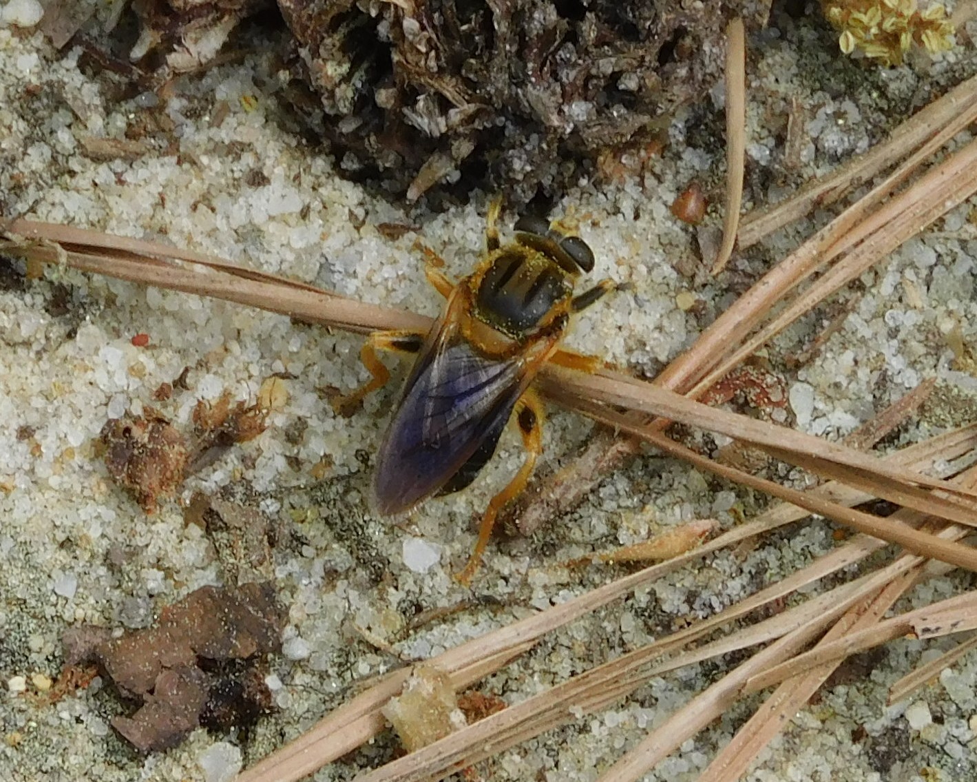 Teuchocnemis lituratus, (Loew, 1863), the Black Spur Fly, is an uncommon species of syrphid fly observed in the eastern half of North America. Syrphid flies are also known as Hover Flies or Flower Flies because the adults are frequently found hovering around flowers from which they feed on nectar and pollen. Adults are 10.5–15.4 mm (0.41–0.61 in)long, black with a yellow scutellum and hind tibia of male with spike. The larvae are unknown.[2][3]