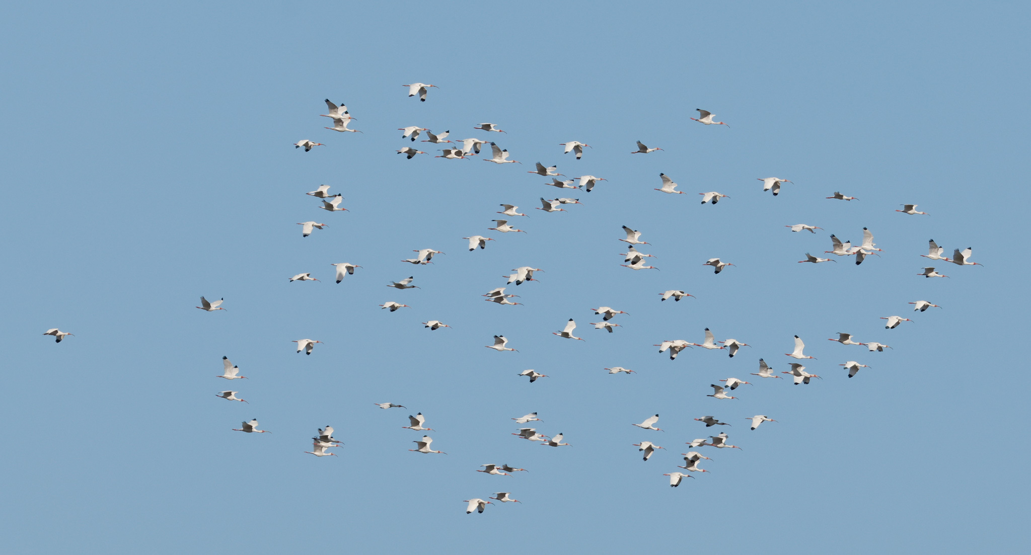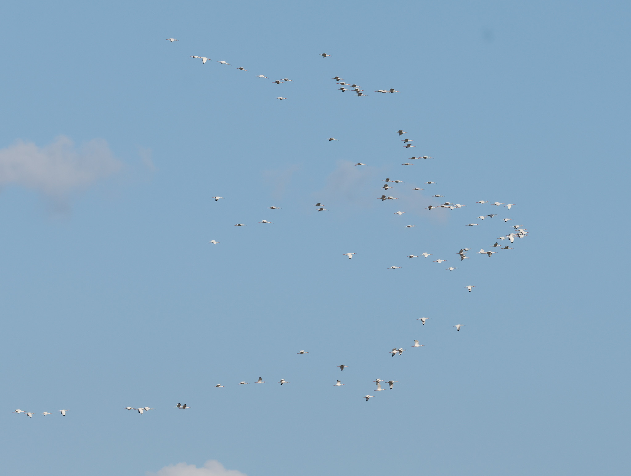 Like other species of ibis, the American white ibis flies with neck and legs outstretched, often in long loose lines or V formations—a 1986 field study in North Carolina noted over 80% of adult ibis doing so, while juveniles rapidly took up the practice over the course of the summer. The resulting improvement in aerodynamics may lower energy expenditure.[20] These lines fly in an undulating pattern as they alternately flap and glide. Soaring in a circular pattern is also seen.[21] Heights of 500 to 1,000 m (1,600 to 3,300 ft) may be reached as birds glide over flights of 20 km (12 mi) or more. More commonly, birds fly between 60 and 100 m (200 and 330 ft) above the ground, gliding or flapping at a rate of around 3.3 wingbeats a second.[22]