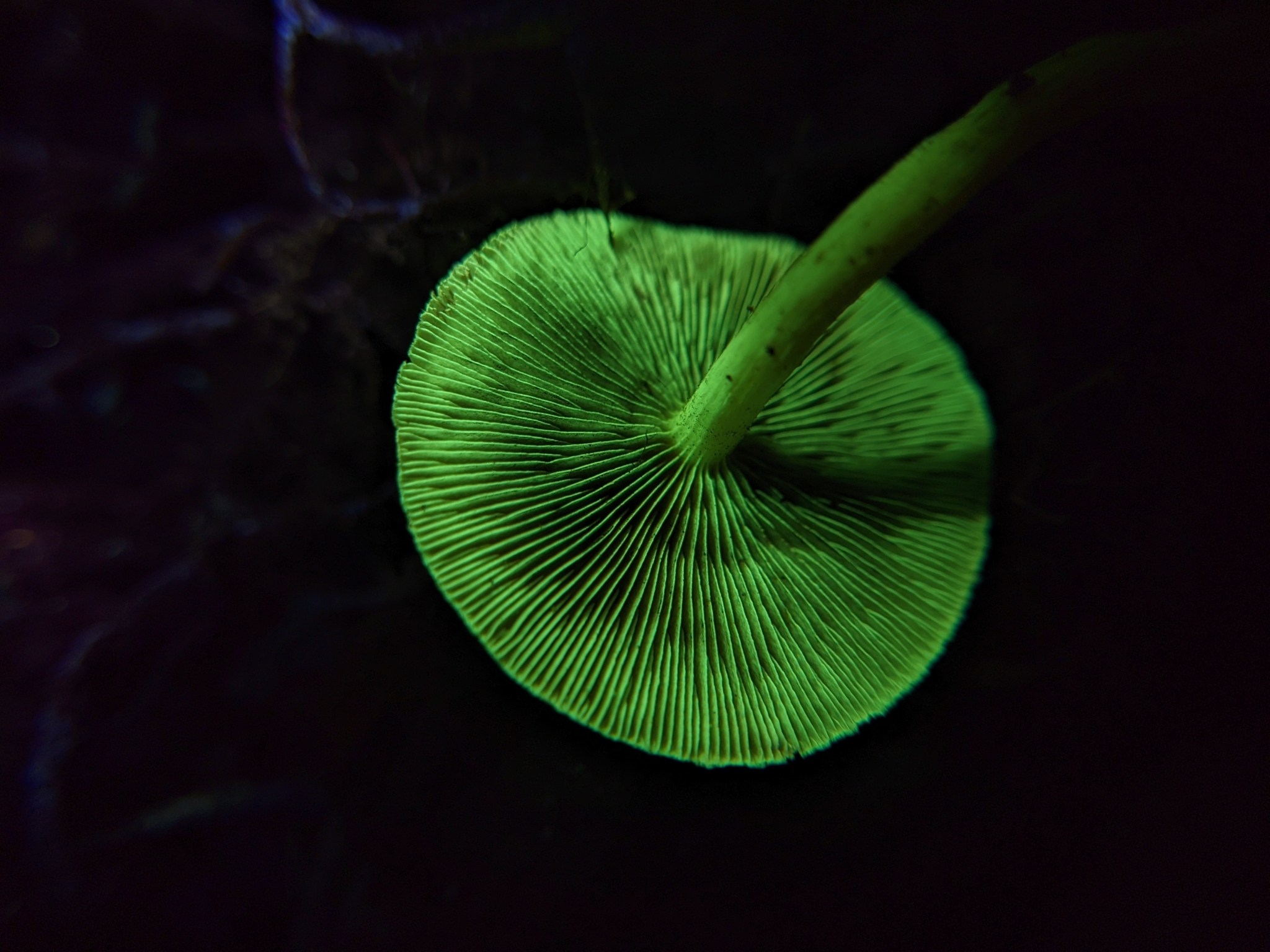 Hypholoma fasciculare fluorescing under 395 nm UV light