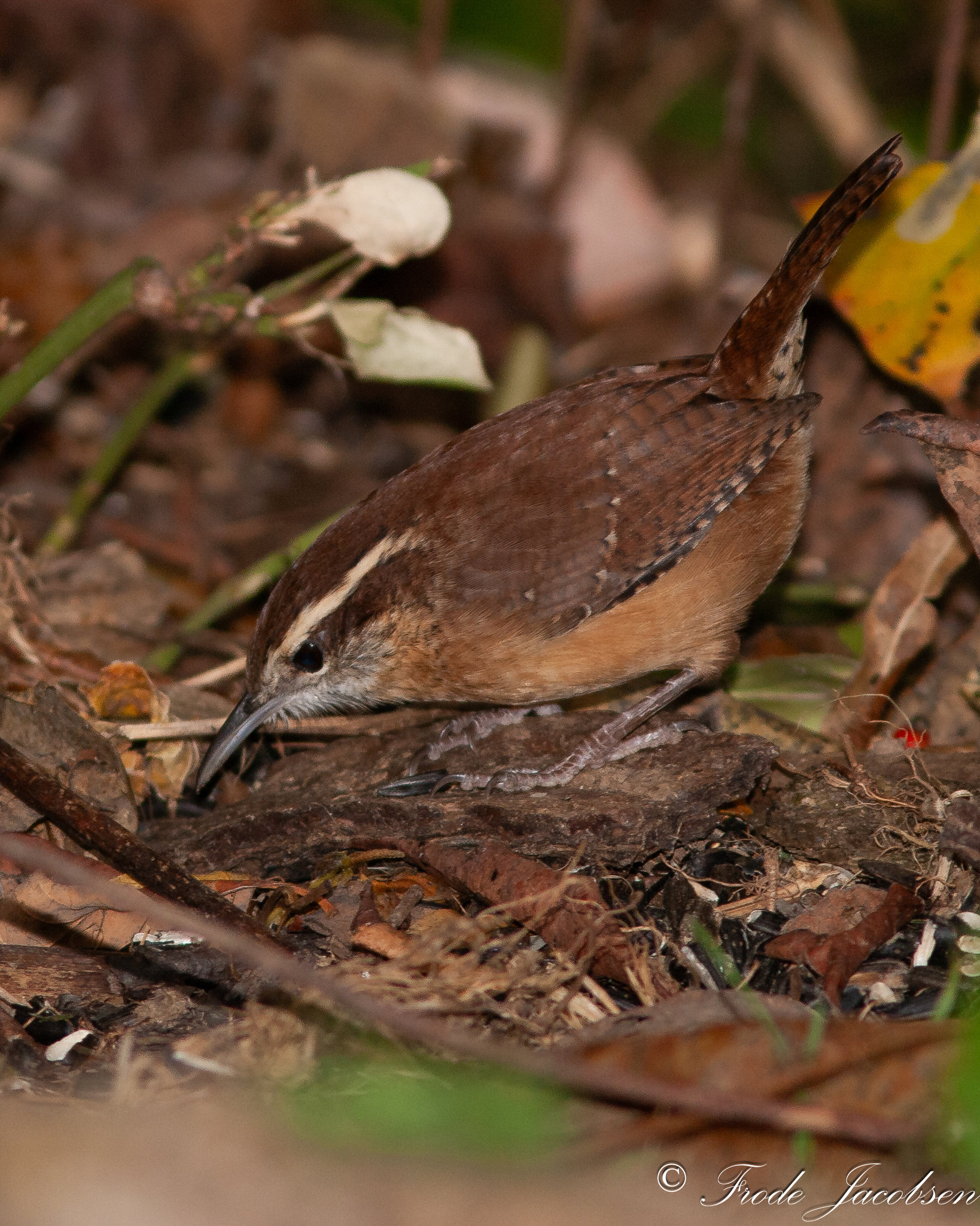 [edit]Carolina wrens spend the majority of their time on or near the ground searching for food, or in tangles of vegetation and vines. They also probe bark crevices on lower tree levels, or pick up leaf-litter in order to search for prey. Their diet consists of invertebrates, such as beetles, true bugs, grasshoppers, katydids, spiders, ants, bees, and wasps. Small lizards and tree frogs also make up the carnivorous portion of their diet. Vegetable matter, such as fruit pulp and various seeds, makes up a small percentage of their diet. In the northern portion of their range, they frequent bird feeders.[3][24]