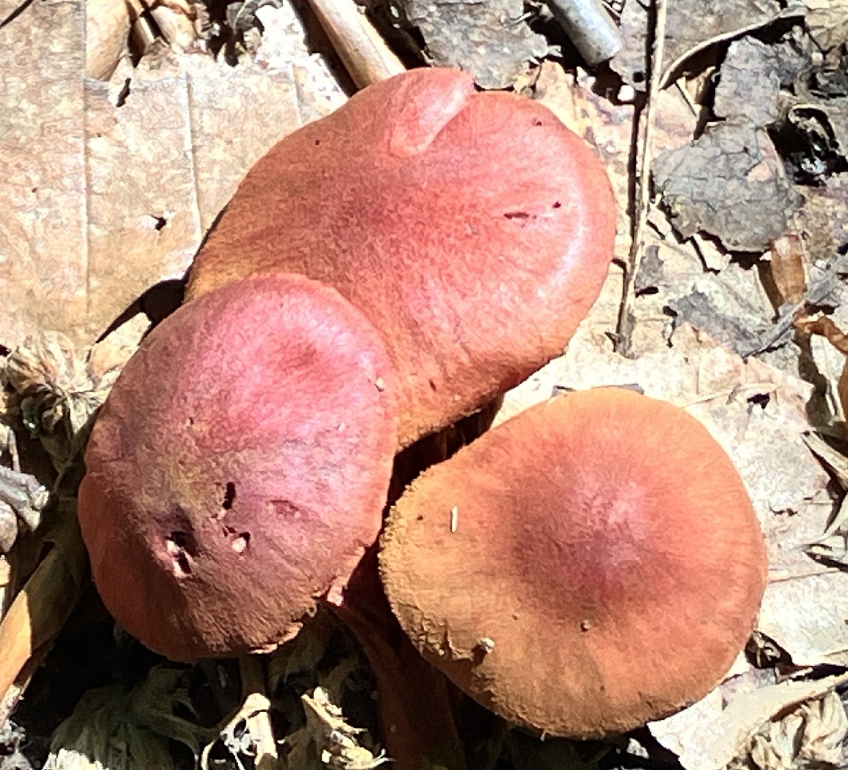 Deep blood red or orange-red cap covered with silky fibrils, convex becoming flattened with prominent umbo in age; flesh rosy-pink. Gill color like cap or darker; stalk color may be lighter (J. Solem, pers. comm.).
