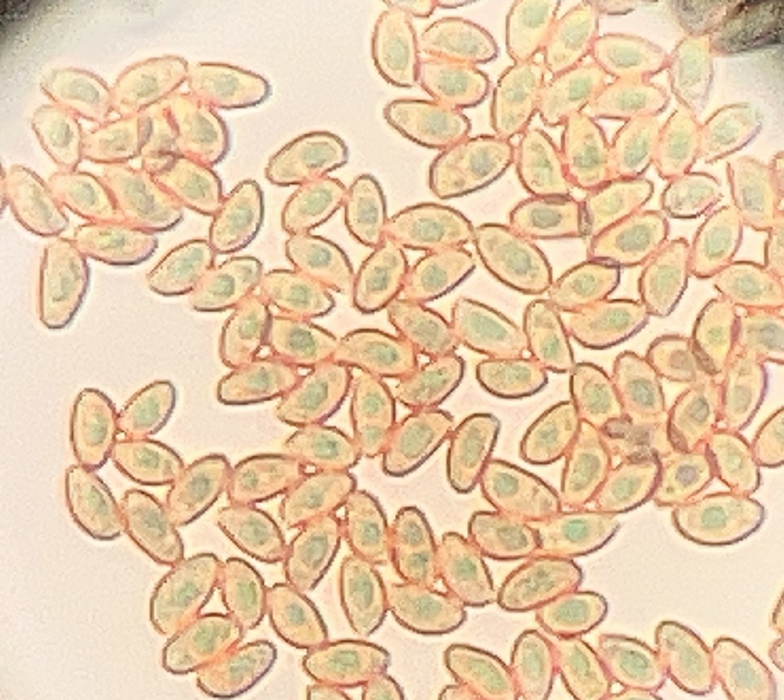 Spored collected from a Blood-red Cort specimen in Howard Co., Maryland (9/12/2011). Almond-shaped, roughened; measured 7.6-8.4 X 4.3-4.7 microns.