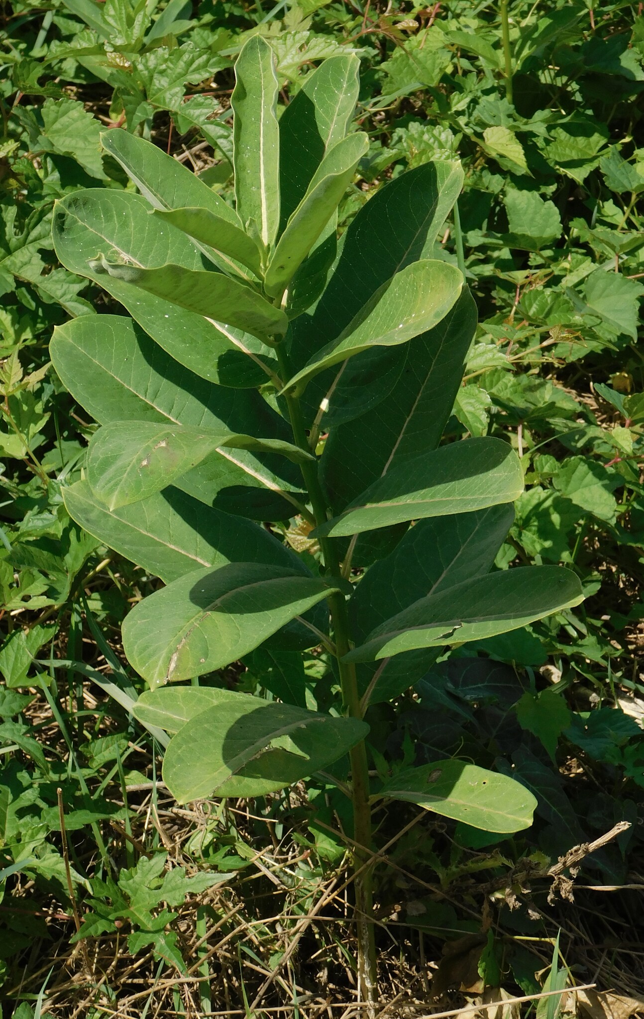 [edit]A. syriaca is a clonal perennial forb whose individual plants grow from propagative roots. All parts of the plants produce a white latex when cut.[5][6] The plant typically grows to a height of 3 to 5 feet (0.91 to 1.52 m), but can reach 8 ft (2.4 m) in ditches and gardens.[7] Its simple leaves are opposite, sometimes whorled, broadly ovate-lanceolate, and 1.5–4.75 inches (3.8–12.1 cm) wide,[5] usually with entire, undulate margins and reddish main veins. Leaves have very short petioles and velvety undersides.[5]