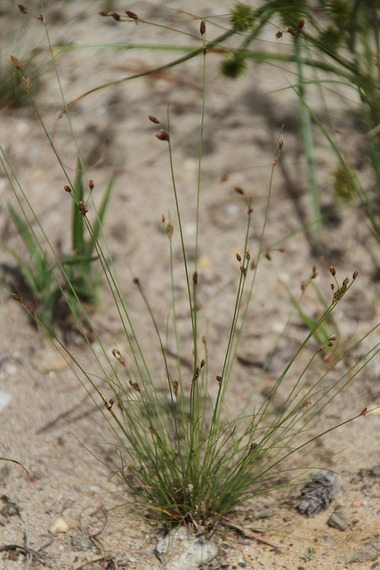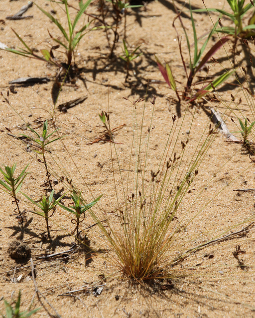 Bulbostylis capillaris grows in many types of habitat, generally in moist areas such as streamside meadows. It is an annual herb which is somewhat variable in appearance but generally takes the form of a small, upright tuft of green herbage growing close to the ground, between 10 and 24 centimeters tall. There are several stems surrounded by thready, thin leaves. The inflorescence occurs at the tip of the stem and is composed of tiny spikelets which are green washed with rusty red. The fruit is about a millimeter long.