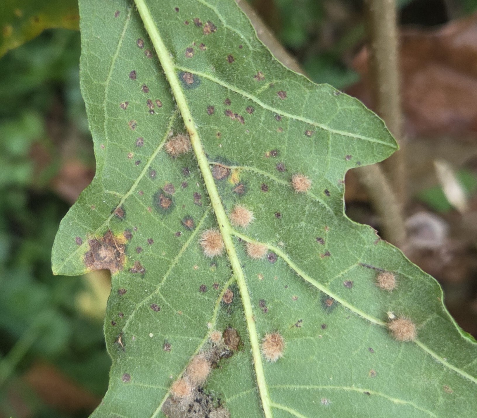 Neuroterus quercusverrucarum galls on a white oak leaf in Baltimore City, Maryland (8/25/2016). Determined by Charley Eiseman/BugGuide.