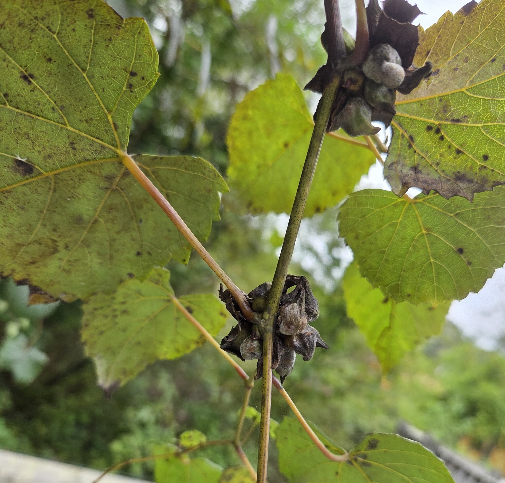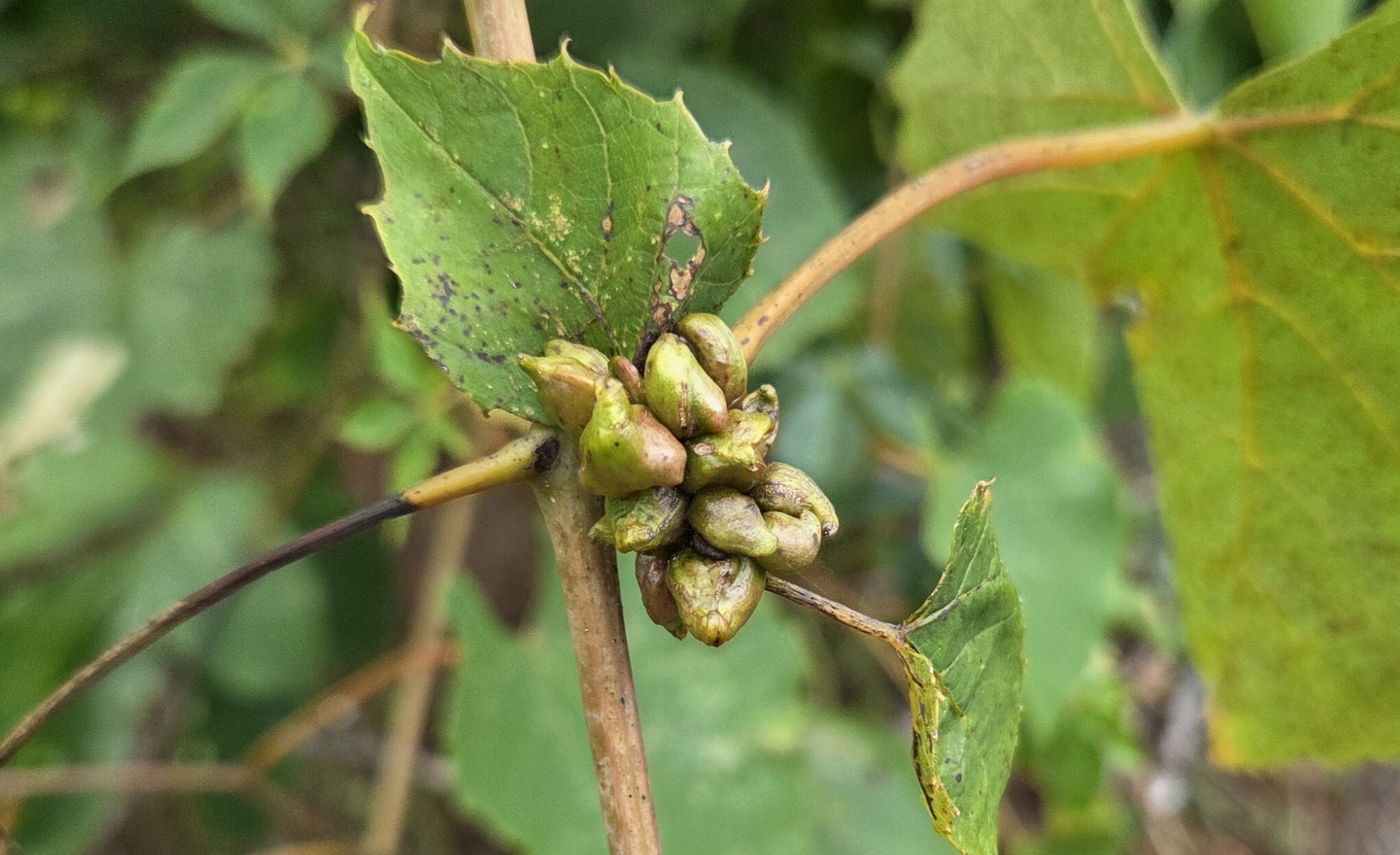 Schizomyia vitiscoryloides galls on a wild grape in Baltimore City, Maryland (8/9/2010). Determined by Charley Eiseman/BugGuide.