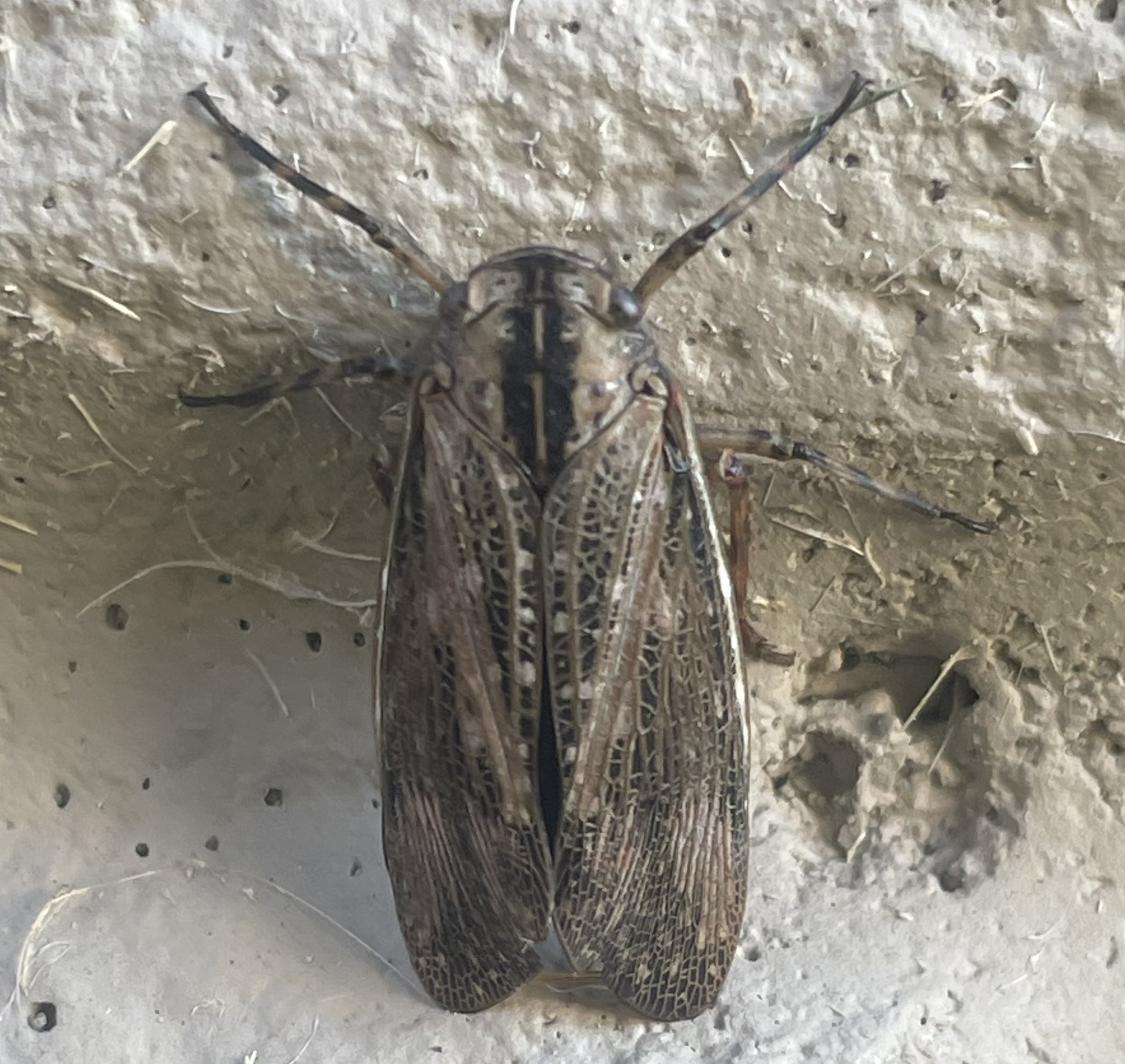 [edit]Adult Angulapteryx texana are mostly grayish-tan in color with bold, brownish black bands extending from the head down to its back. The forewings have pinkish spots that appear in a mottled pattern. the legs are bicolored, being black and tan. The adults are 18-20 millimeters (0.71-0.79 inches) long. The nymphs are reddish-brown in color with a faint white band extending down the middle of the thorax. The head is rounded.[2]