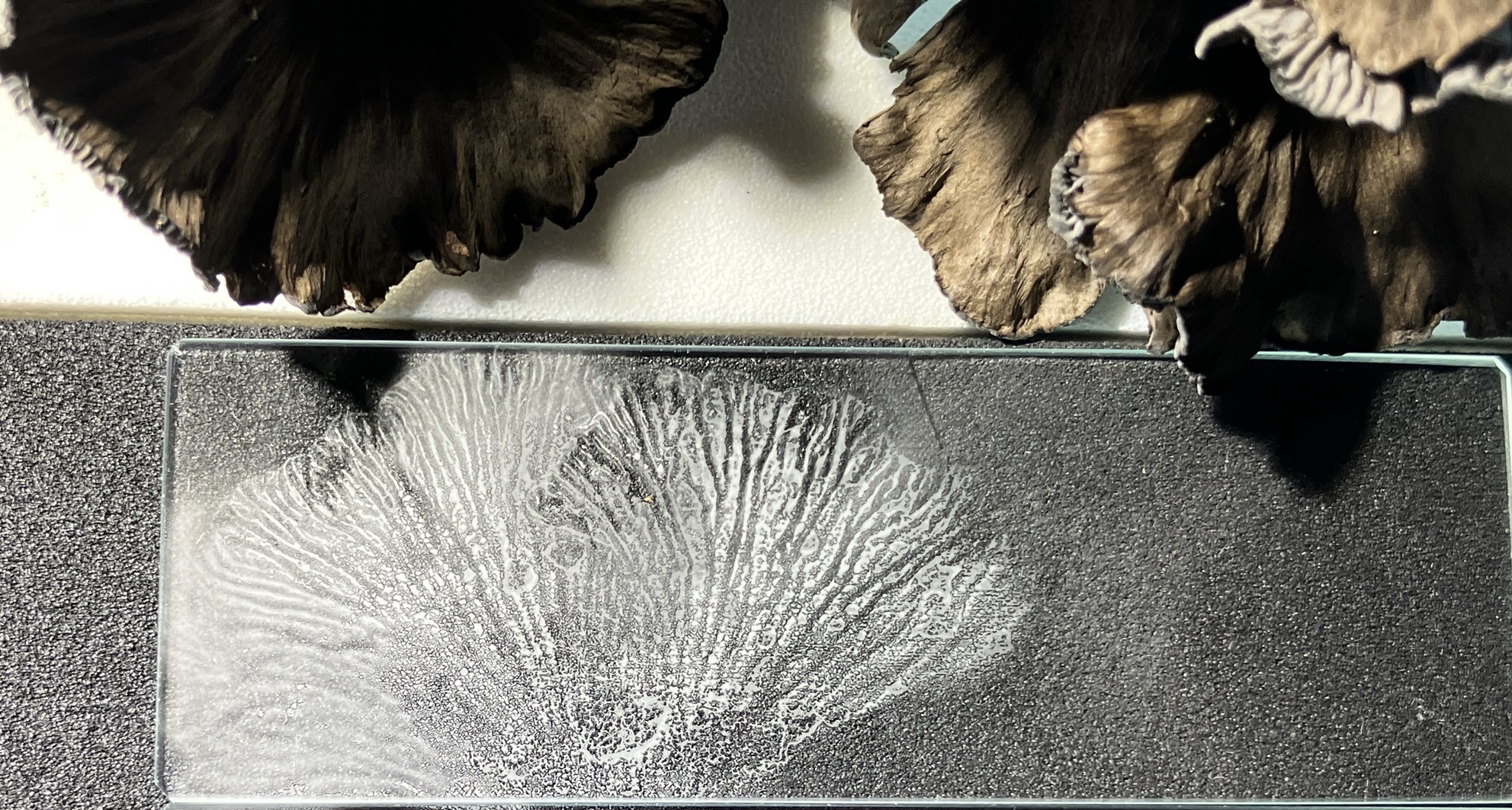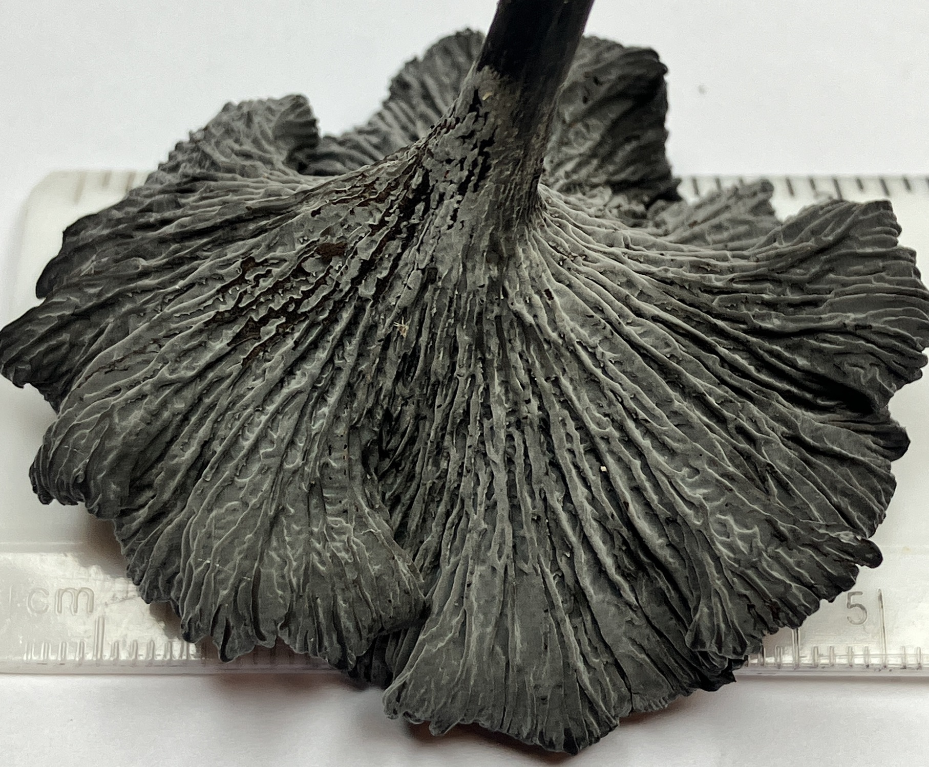 The cap is 1.5–5 cm (1⁄2–2 in) across,[1] in an irregular funnel shape or infundibuliform. It is irregularly wavy at the edges with an inrolled margin. It is black when moist, brownish whey dry or in age.[1] The stem is 2–8 cm long and up to 1.3 cm thick.[1] It is smooth to lightly velvety in texture, sometimes with a white woolly base. The veins/ridges are dark grey, irregular forks which are distant and decurrent.