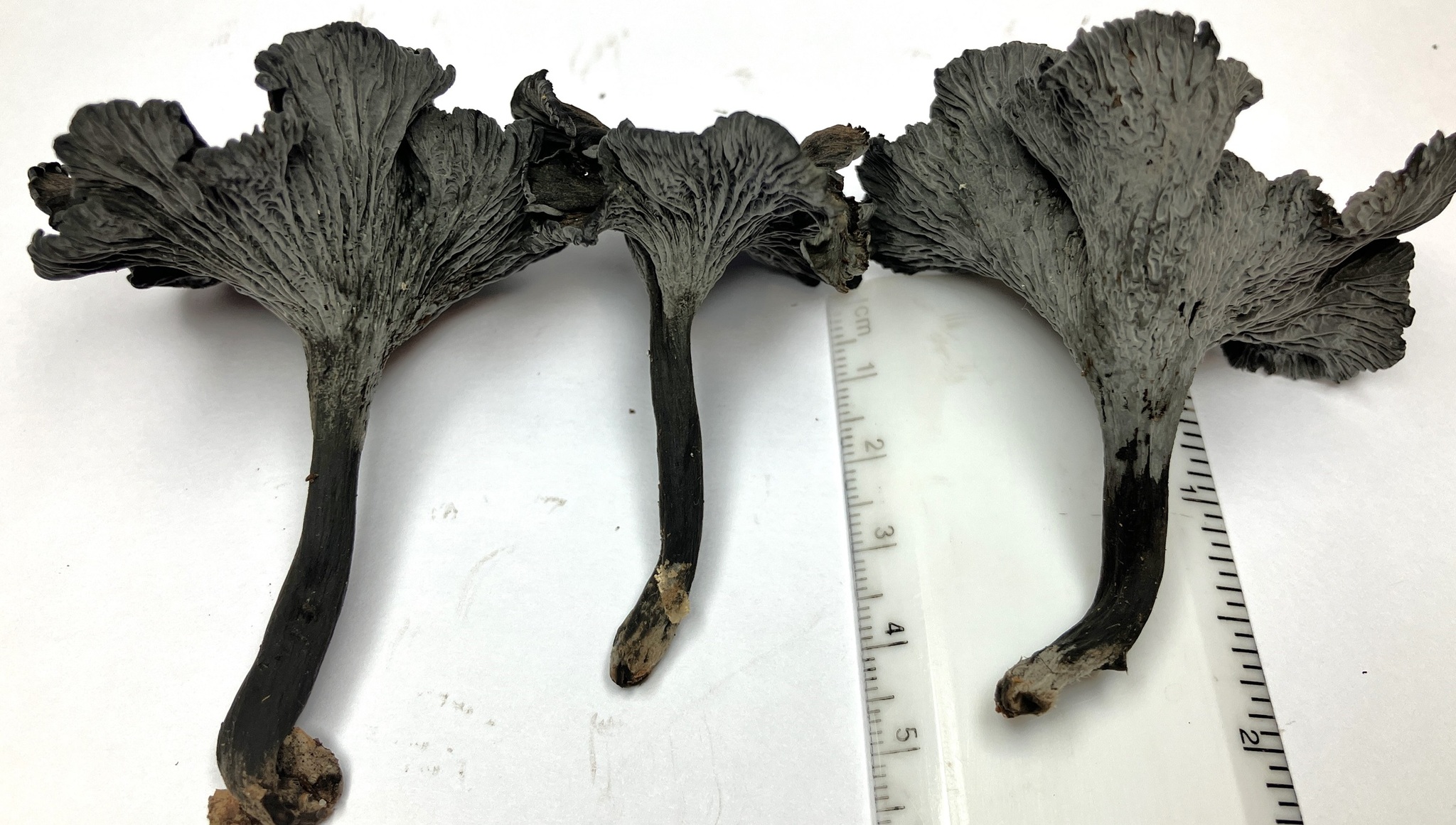 [edit]Craterellus cinereus are greyish-black chanterelle mushrooms with thin, dark grey flesh that fades when dry. The fruiting body can reach 12 centimetres (4+3⁄4 in) tall.[1]
