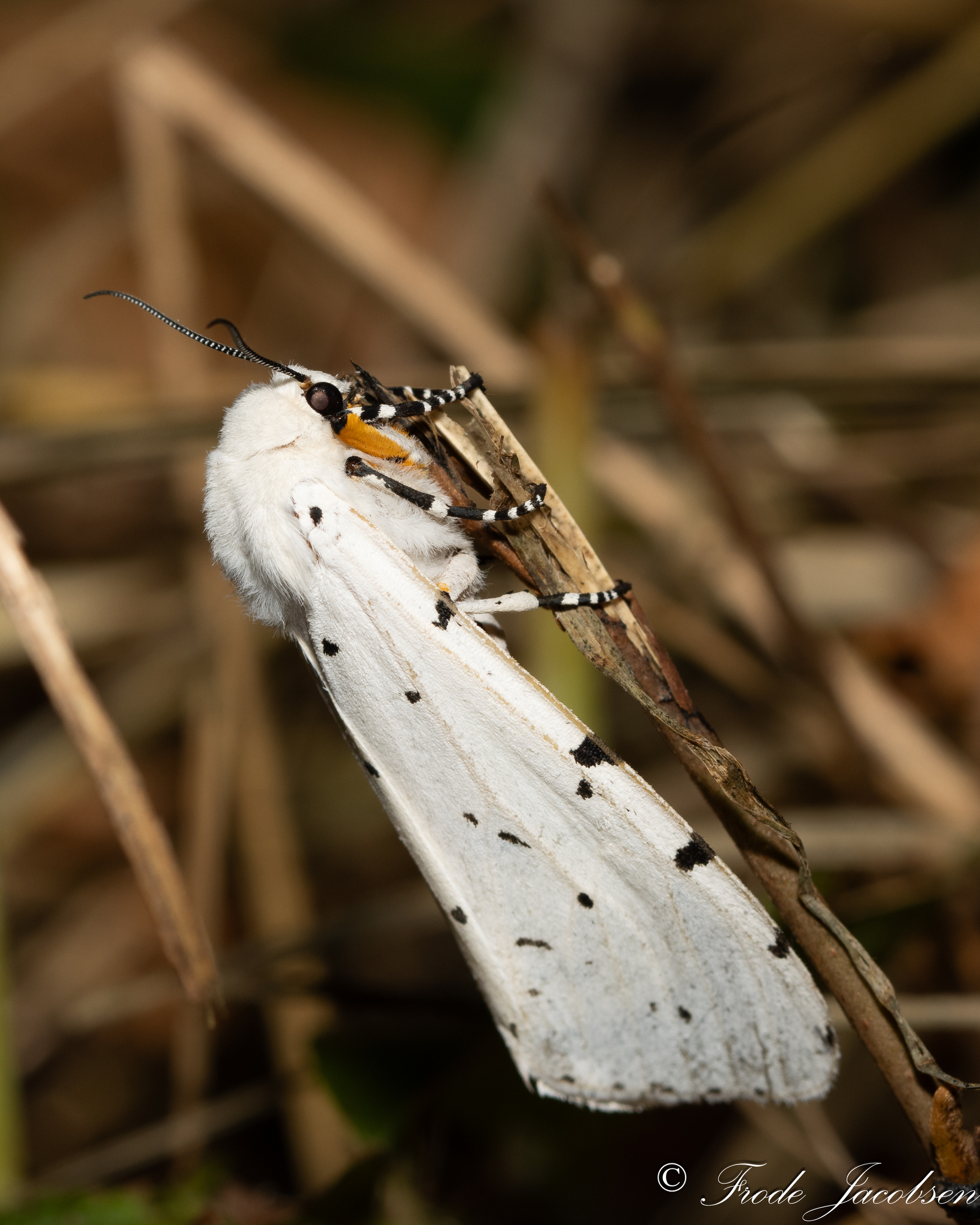 [edit]The head and thorax are white, and the abdomen is yellow orange with a row of black spots. The forewing is white with a variable pattern of black spots, with some individuals lacking any spots. The hindwing is yellow orange in males and white in females. Both sexes have three or four black spots or blotches on the hindwings. The wingspan measures 4.5 to 6.8 cm (1.8 to 2.7 in).[3]