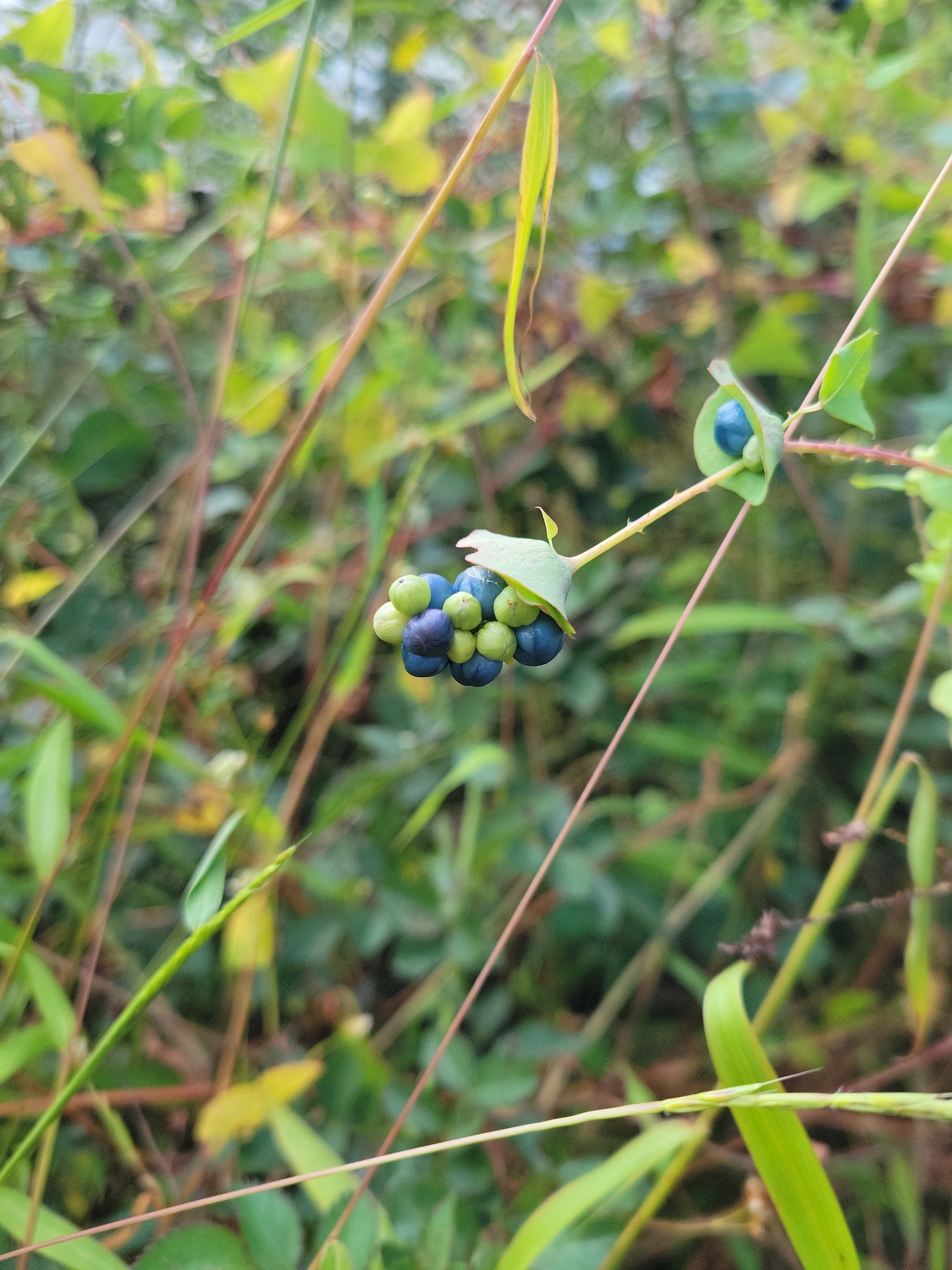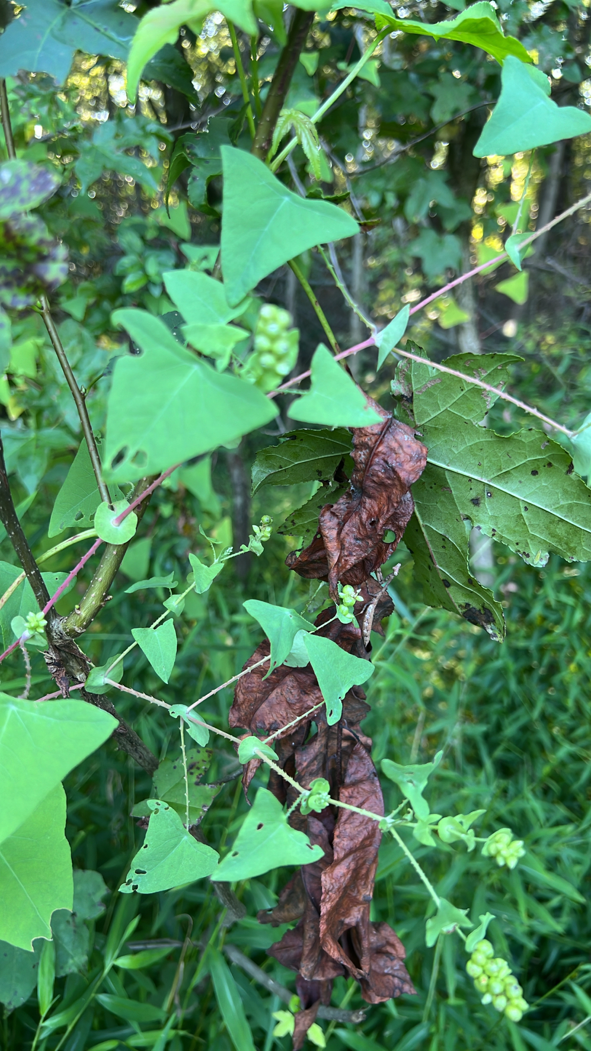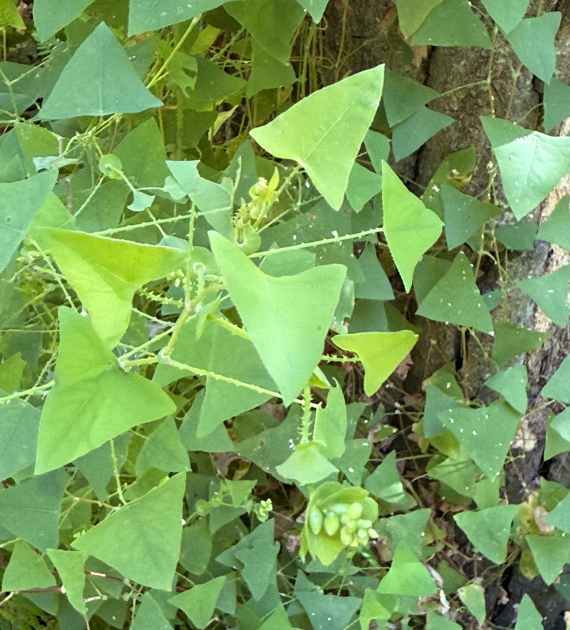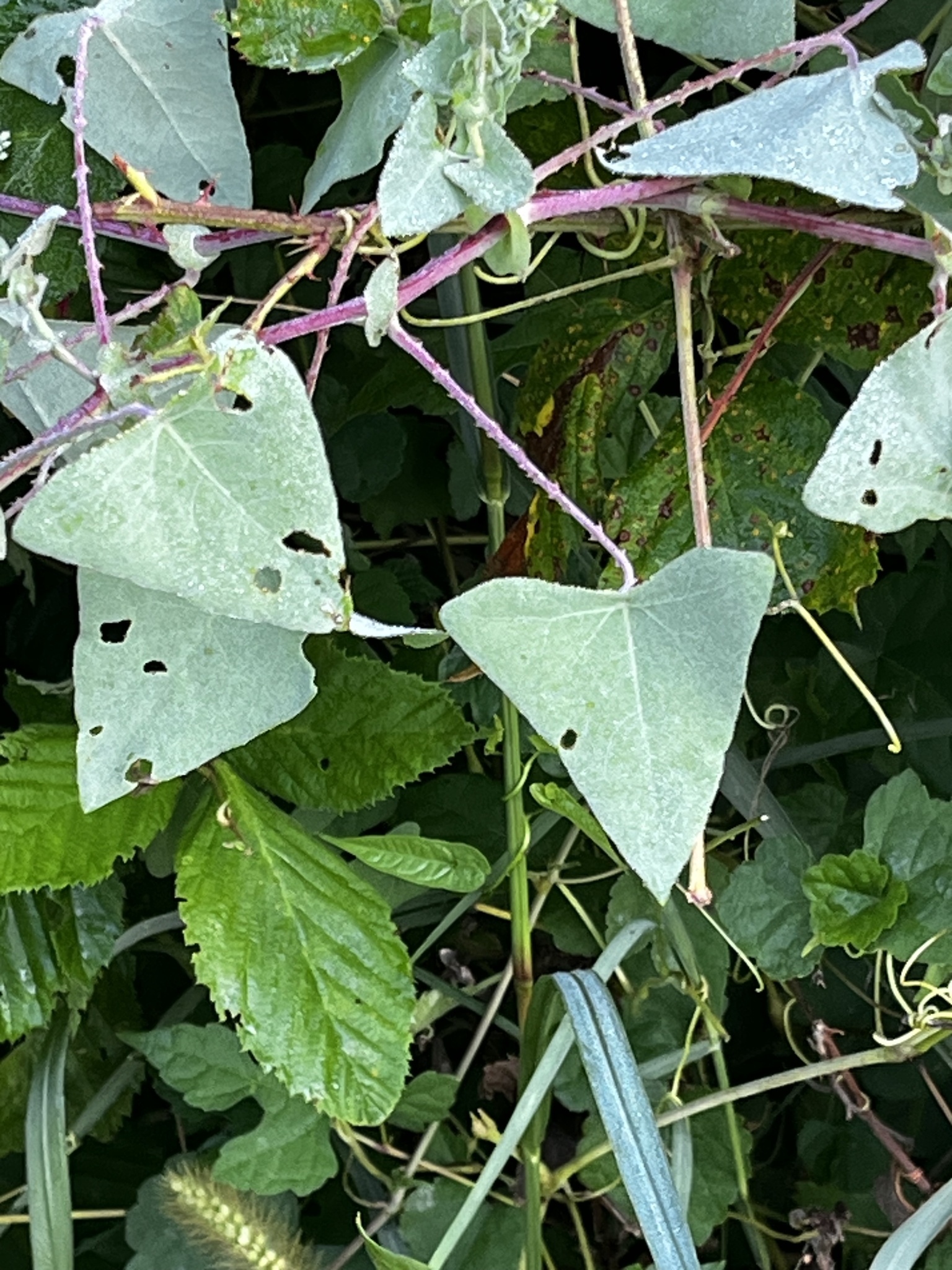 Persicaria perfoliata (basionym Polygonum perfoliatum[1]) is a species of flowering plant in the buckwheat family. Common names include mile-a-minute, devil's tail, giant climbing tearthumb,[2][3] and Asiatic tearthumb.[4] It is a trailing herbaceous annual vine with barbed stems and triangular leaves. It is native to most of temperate and tropical eastern Asia, occurring from eastern Russia and Japan in the north, and the range extending to the Philippines and India in the south.[5][6]