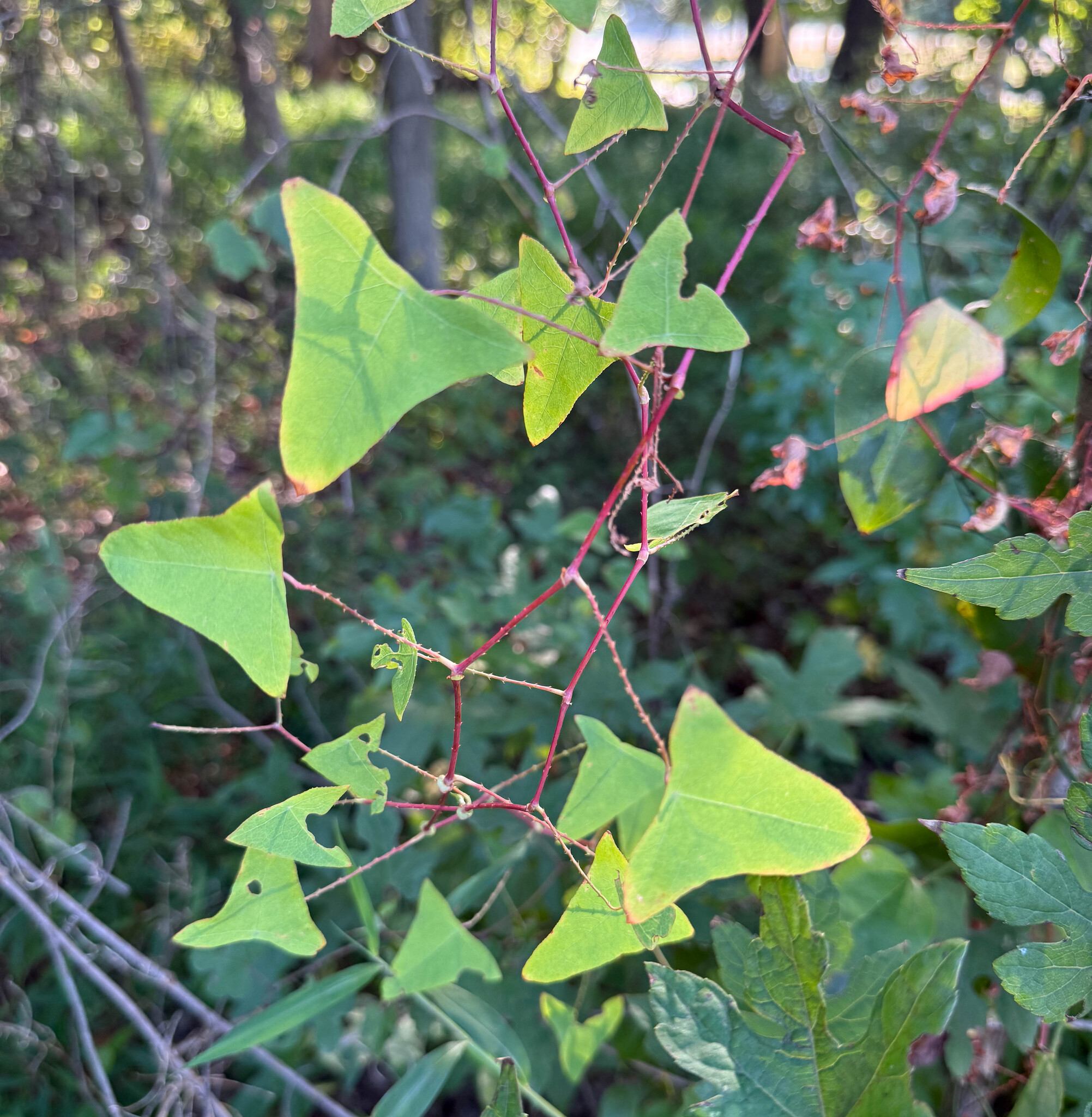 Persicaria perfoliata has a reddish stem that is armed with downward pointing hooks or barbs which are also present on the underside of the leaf blades. The light green leaves are shaped like an equilateral (equal-sided) triangle and alternate along the narrow, delicate stems. Distinctive circular, cup-shaped leafy structures, called ochreas, surround the stem at intervals.