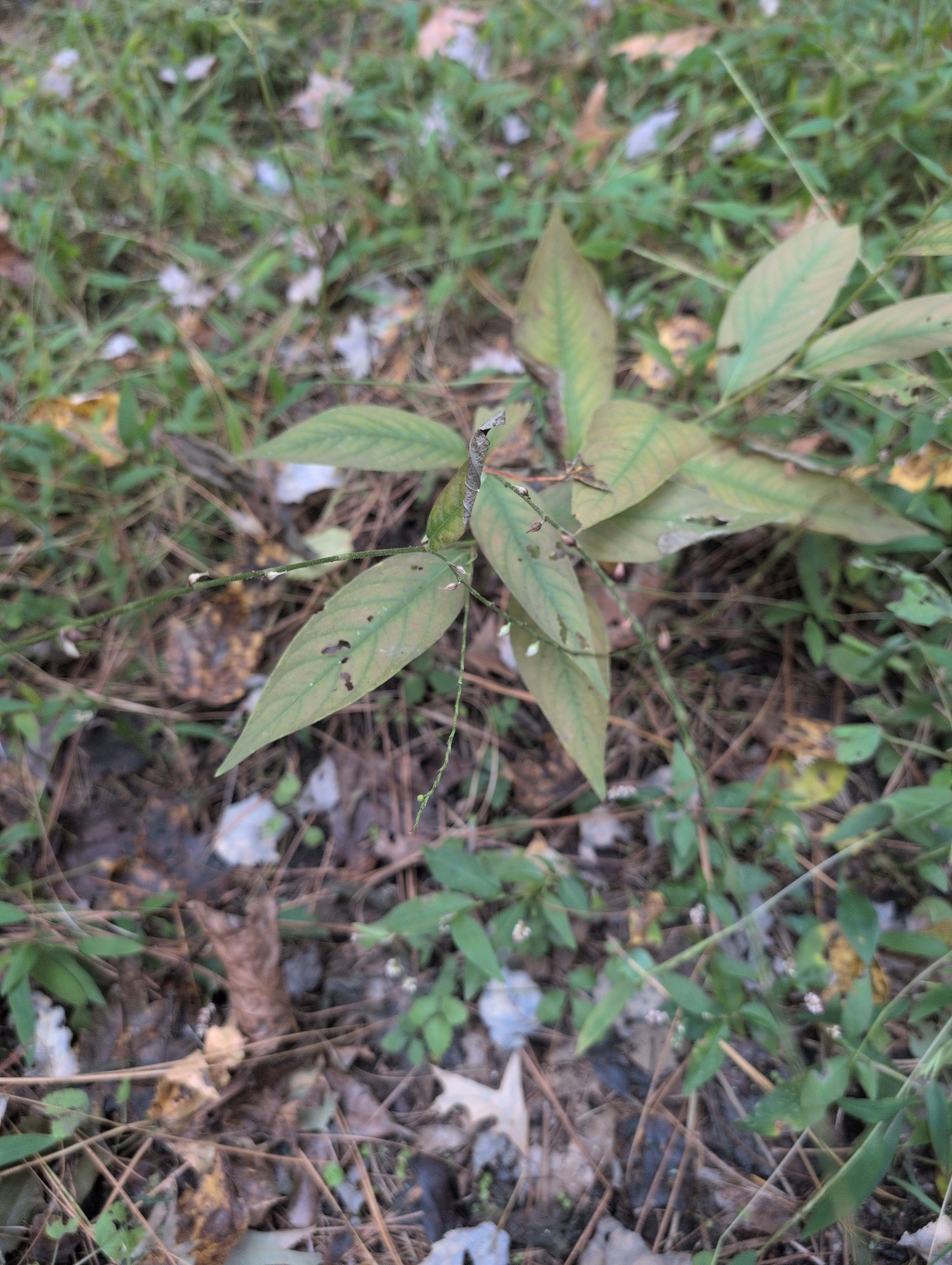 [edit]Like other Persicaria, jumpseed has alternate leaves, with fine-hairy stipular sheaths (ocrea) with bristle-fringed edges which often turn brownish. Flowers, widely spaced along slender stalks, are white to greenish-white, rarely pink-tinged, and fruiting flowers have two downward-pointing hook-tipped styles.[4] Persicaria virginiana is easily distinguished from most other Persicaria species by its much larger, more oval-shaped leaves, although a few species also have large leaves. It sometimes has a chevron-shaped marking on the leaves; often a single plant will have this marking on some leaves but not others.