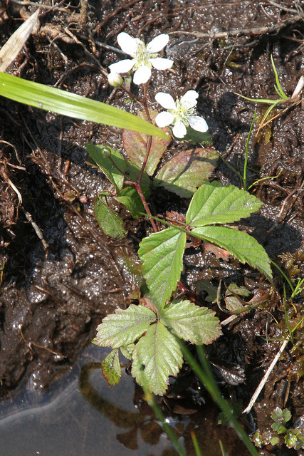 [edit]Rubus hispidus is a small, herb-like shrub up to 20 cm (8 inches) tall. The twigs are red and have bristles. Flowers are generally in small clumps, each with five white rounded petals. The fruit are dark purple, almost black.[3]