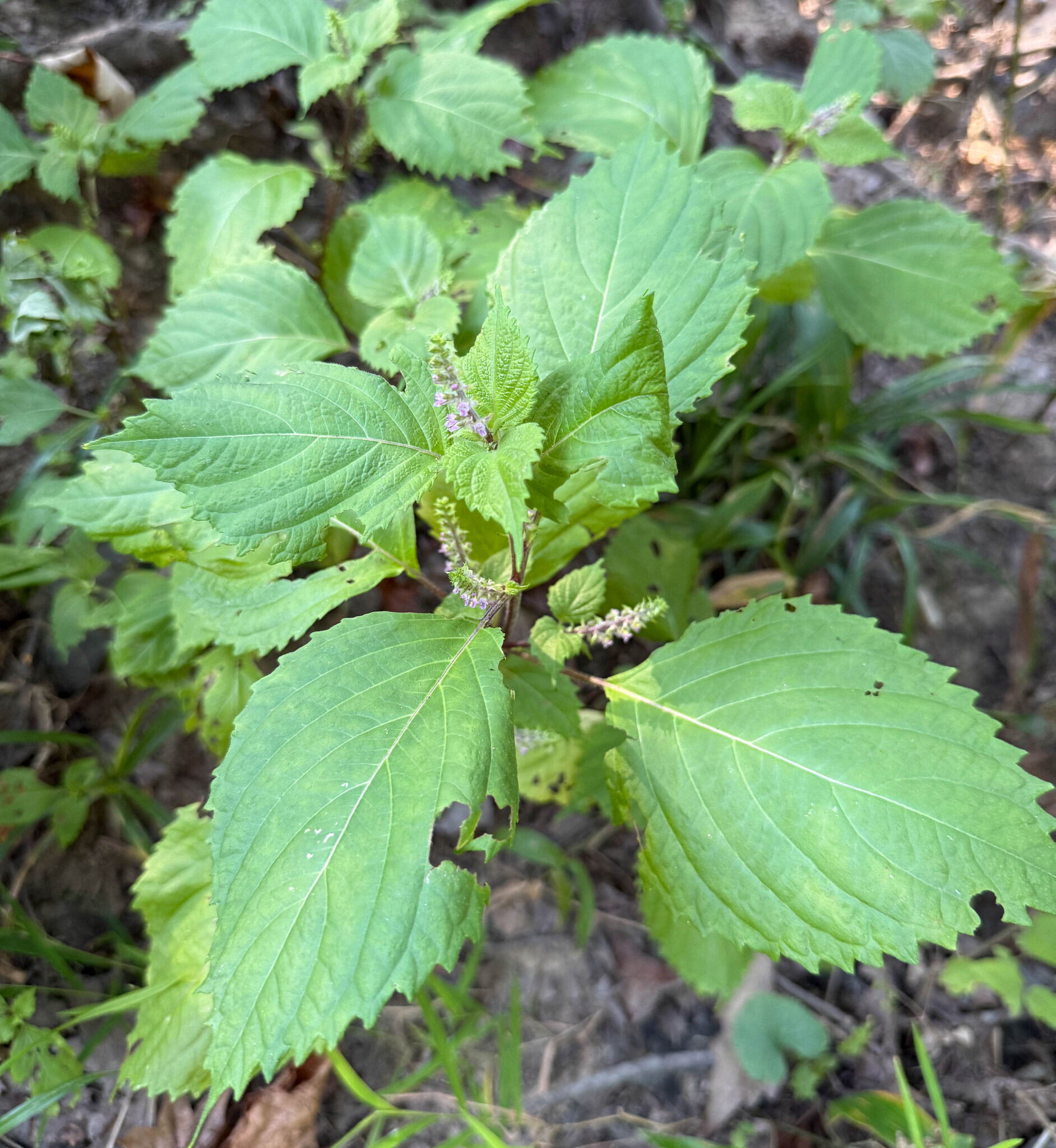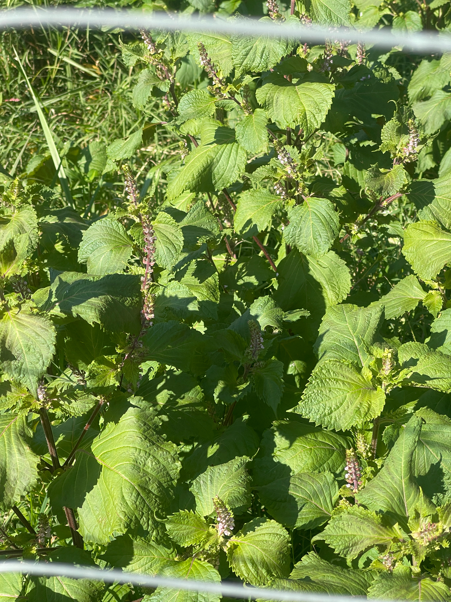 In the United States, the plant is known by many names, such as perilla mint, beefsteak plant, purple perilla, Chinese basil, wild basil, blueweed, Joseph's coat, wild coleus, and rattlesnake weed.[6]