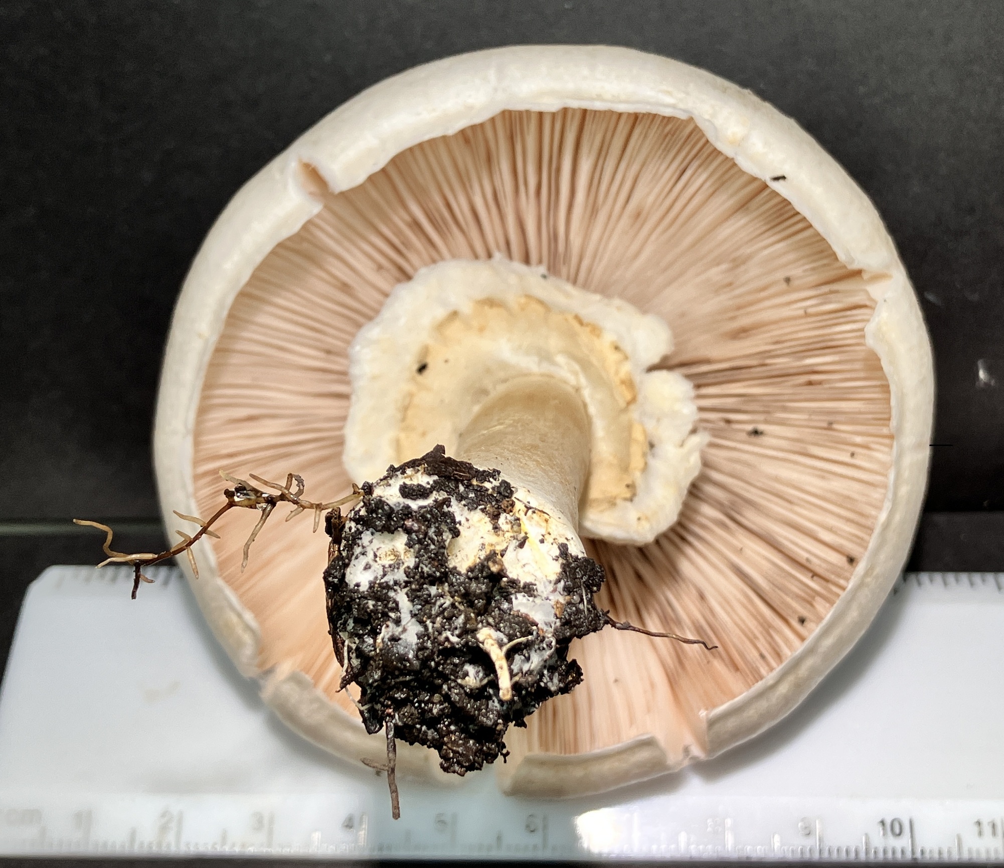 [edit]The cap is 7–20 cm (3–8 in) across, whitish, smooth, and dry; it stains yellow, particularly when young.[4] The gills are pale pink to white at first, later passing through grey and brown to become dull chocolate.[4] A large, spreading ring has white above, but sometimes with yellowish scales underneath. Viewed from below, on a closed-cap specimen, the twin-layered ring has a well-developed "cogwheel" pattern around the stipe. This is the lower part of the double ring. The stalk is 5–12 cm (2–4+1⁄2 in) long and 1–3 cm wide.[4]
