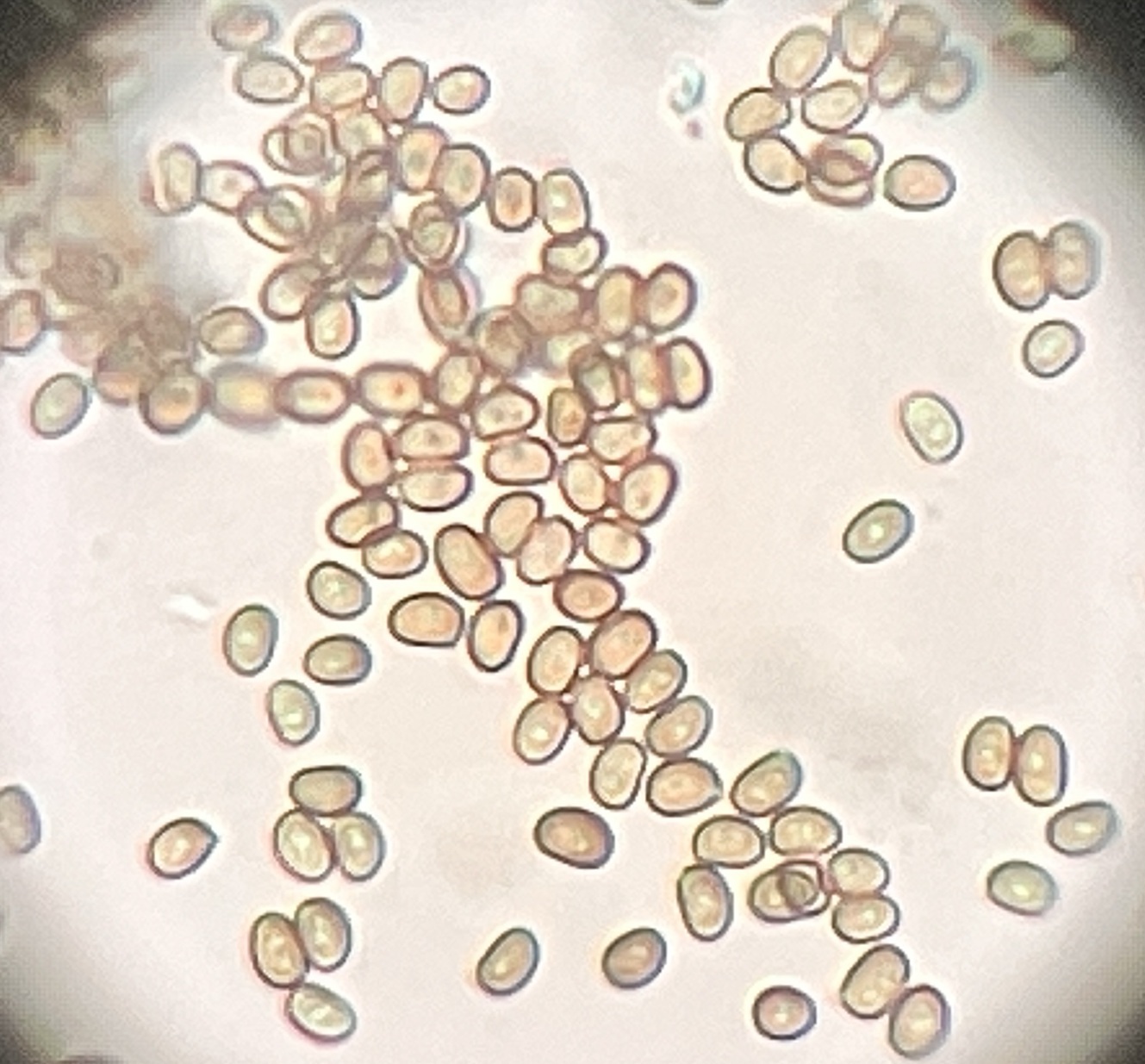 The spores are brown and smooth,[4] producing a dark brown spore print.[5] Its odor is similar to that of almond extract or marzipan, due to the presence of benzaldehyde.[6] It tends to stain yellow on bruising.[7]