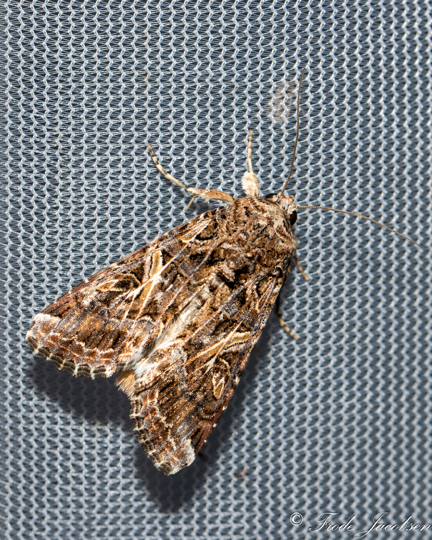 [edit]The wingspan of the adult moth is 32–44 millimetres (1+1⁄4–1+3⁄4 in). The fore-wing is brown with tan markings and a blurry white stripe coming from the wing tip. The hind-wing is white with a thin brown margin. Larvae are black with thin yellow stripes on their sides.[2]