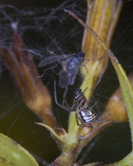 [edit]The spiders' webs have an unusual design. The spiders weave a fairly complex sheet web system consisting of an inverted dome-shaped web, or "bowl," suspended above a horizontal sheet web, or "doily." The spider hangs from the underside of the "bowl," and bites through the web prey that falls down into the non-sticky webbing. This web design allows the spider to survey its prey below the web while remaining above in a protected location. The webs are commonly seen in weedy fields and in shrubs.