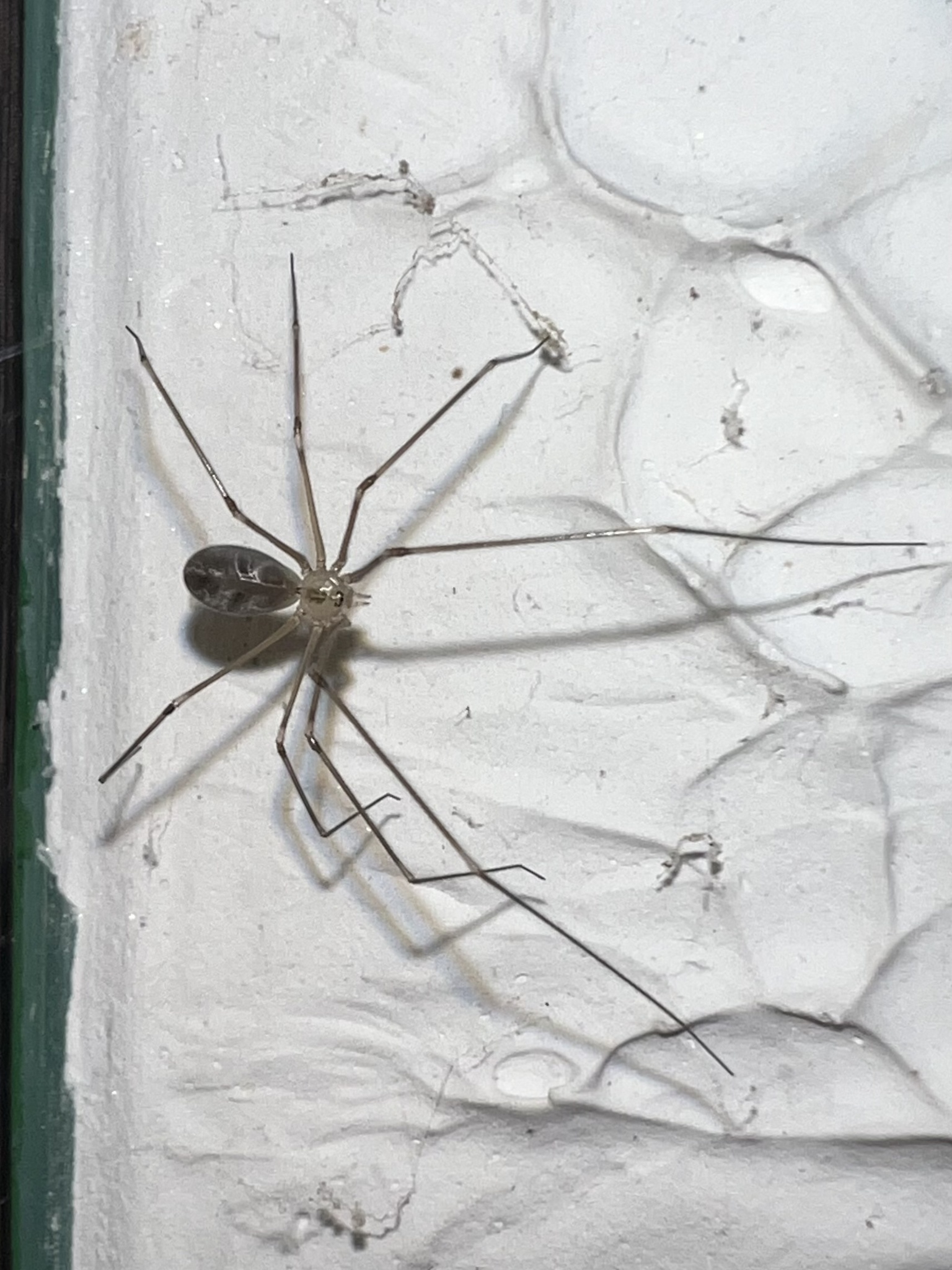 Females have a body length of about 8 mm while males tend to be slightly smaller. The length of the spider's legs are on average 5 or 6 times the length of its body.[3] Pholcus phalangioides has a habit of living on the ceilings of rooms, caves, garages or cellars.