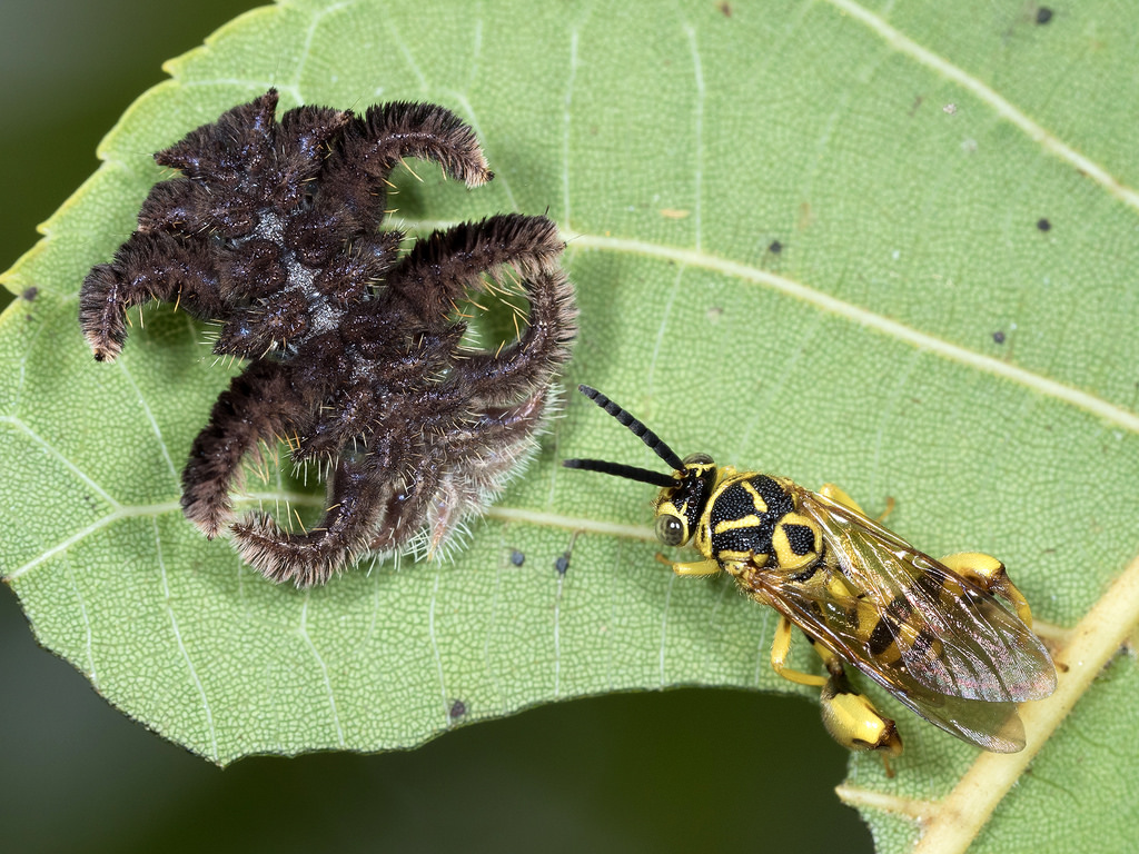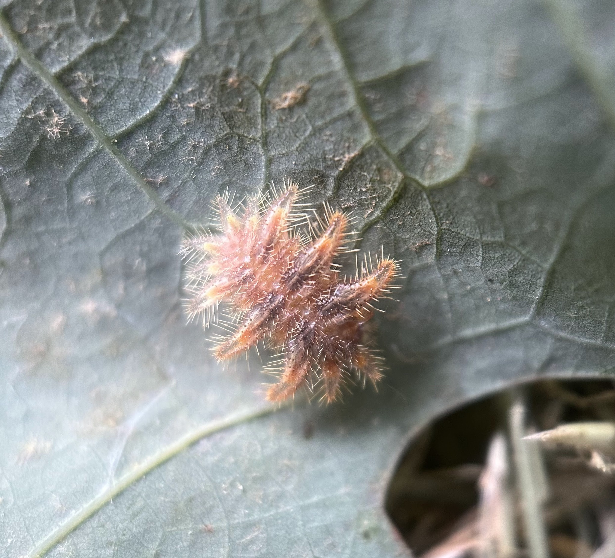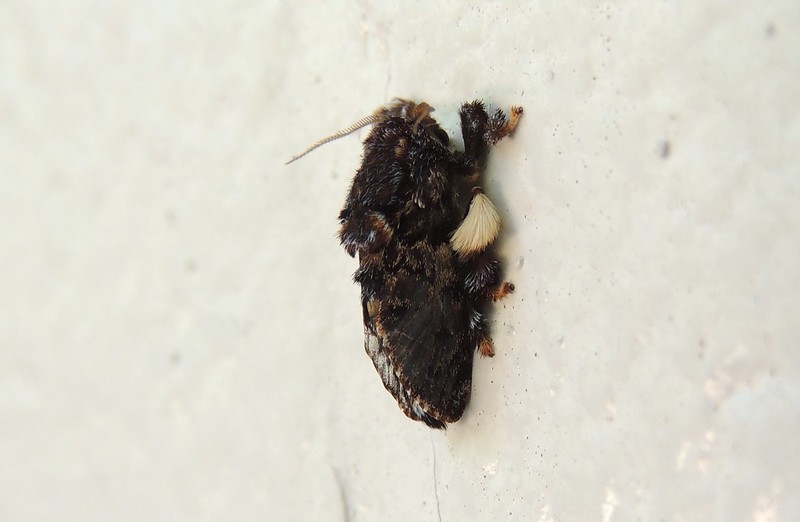 [edit]The larva is distinctive, with no close analogues, although it may be mistaken for the shed skin of a hairy spider or leaf debris.[1] It has nine pairs of curly projections or tubercles of varying lengths from the flattened body, each densely covered in hairs. The third, fifth and seventh projection are often longer than the others.[2] The caterpillar has been reported to cause irritation to humans. [1][2][3] Like all limacodids, the legs are shortened and the prolegs are reduced to suction cups. The "arms" or tubercles can fall off without harming the caterpillar, aiding the larva in defense. The larvae are 1.5–2.5 centimetres (0.59–0.98 in) in length.[1][2]