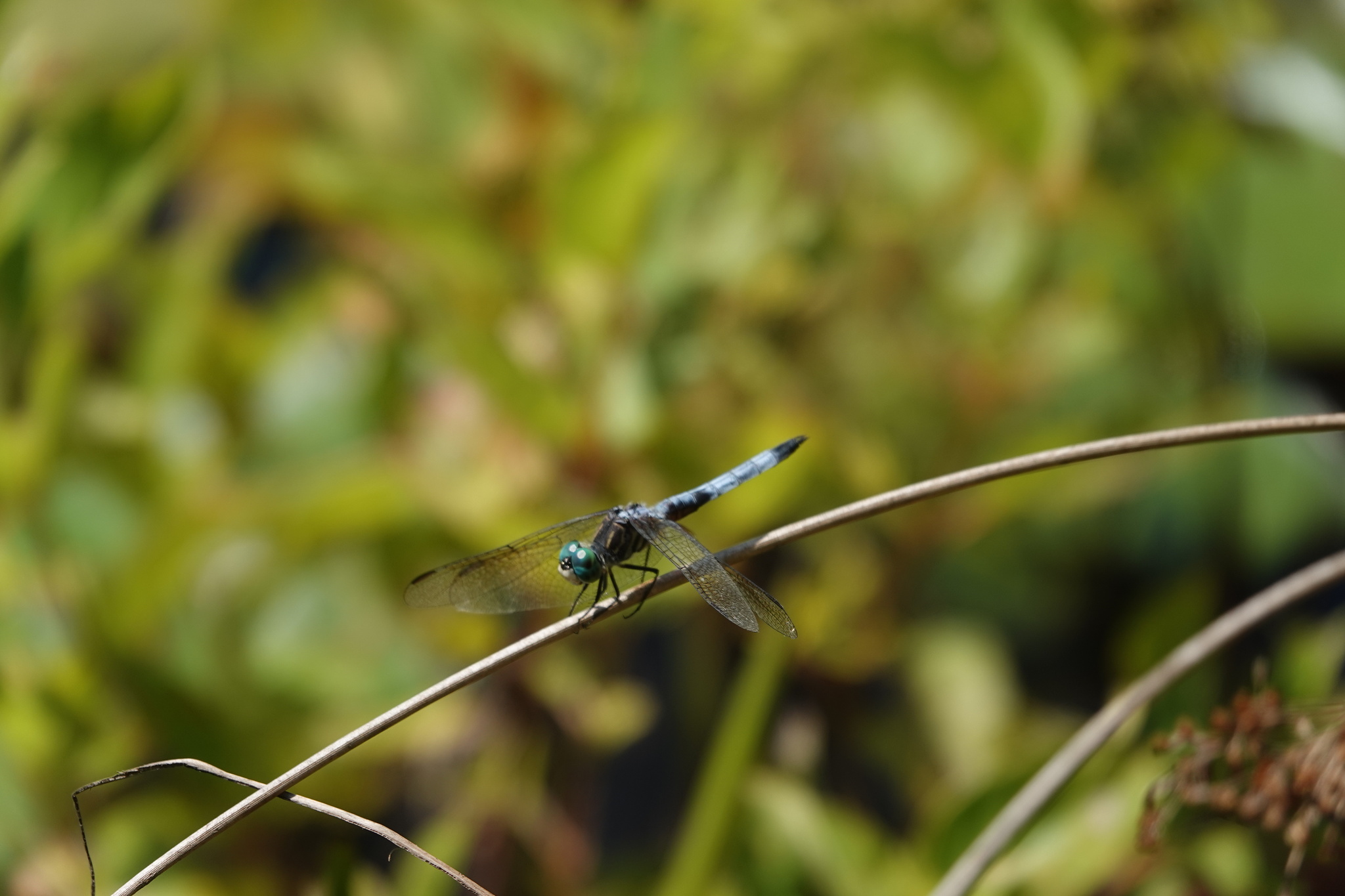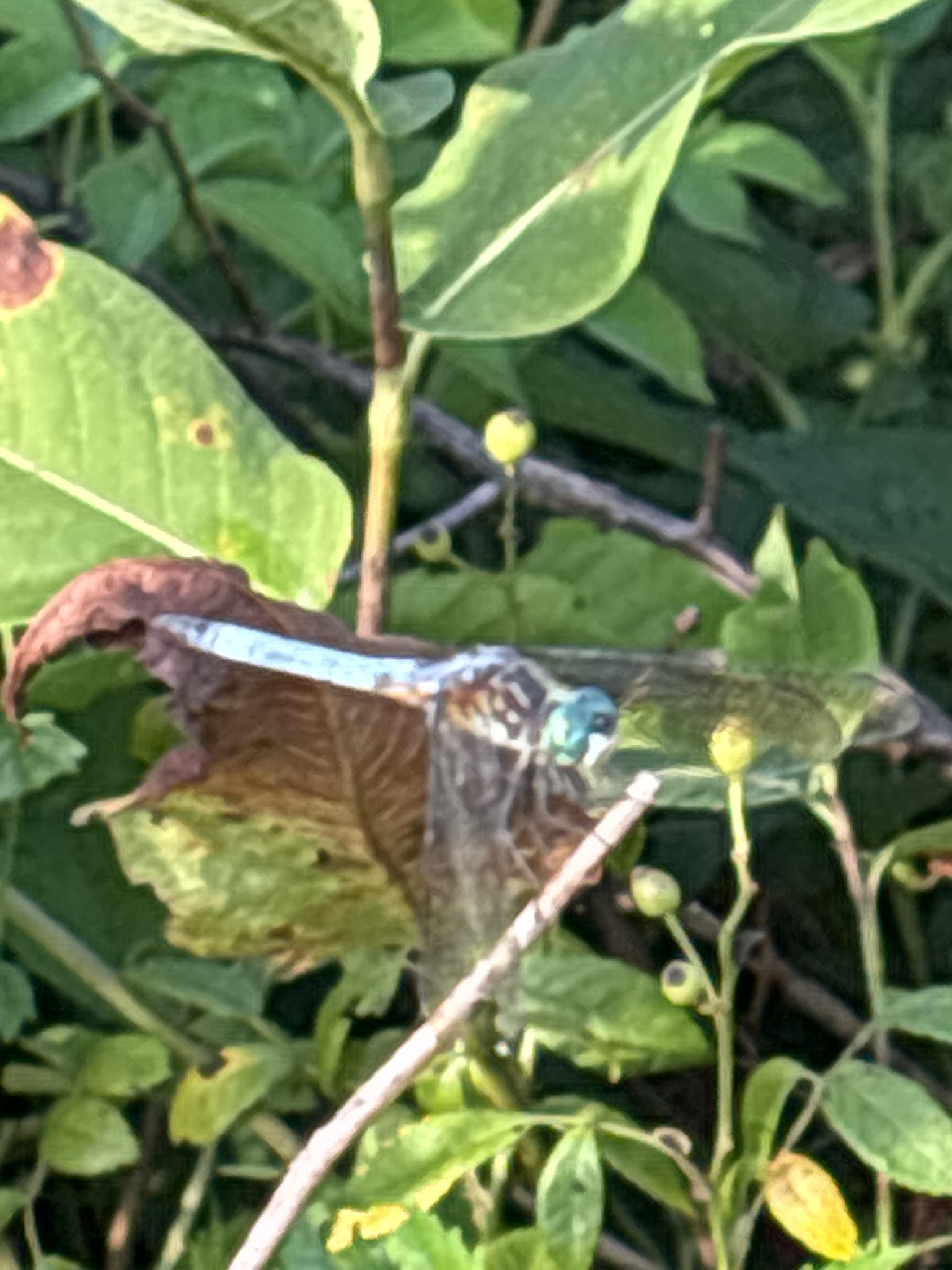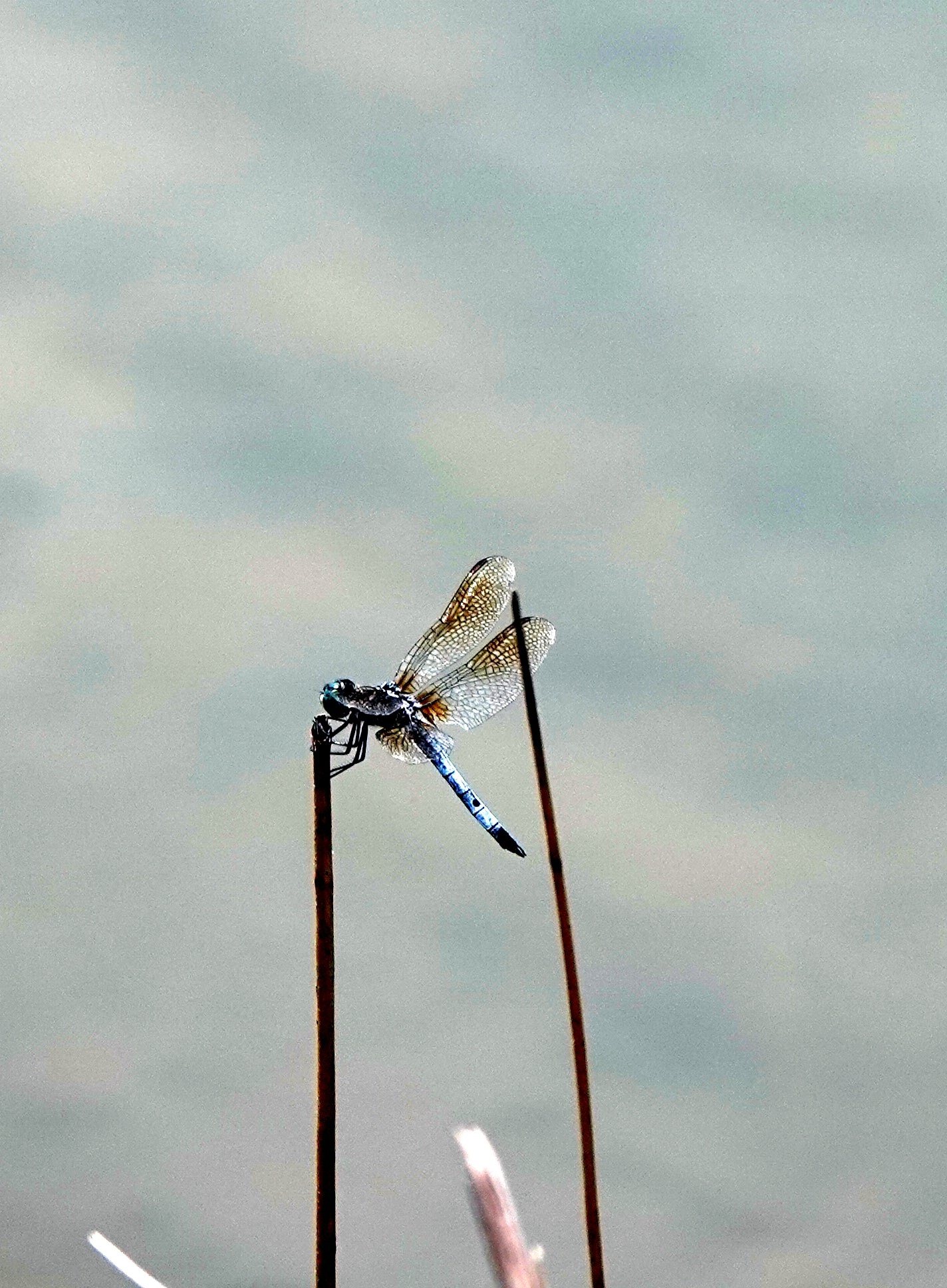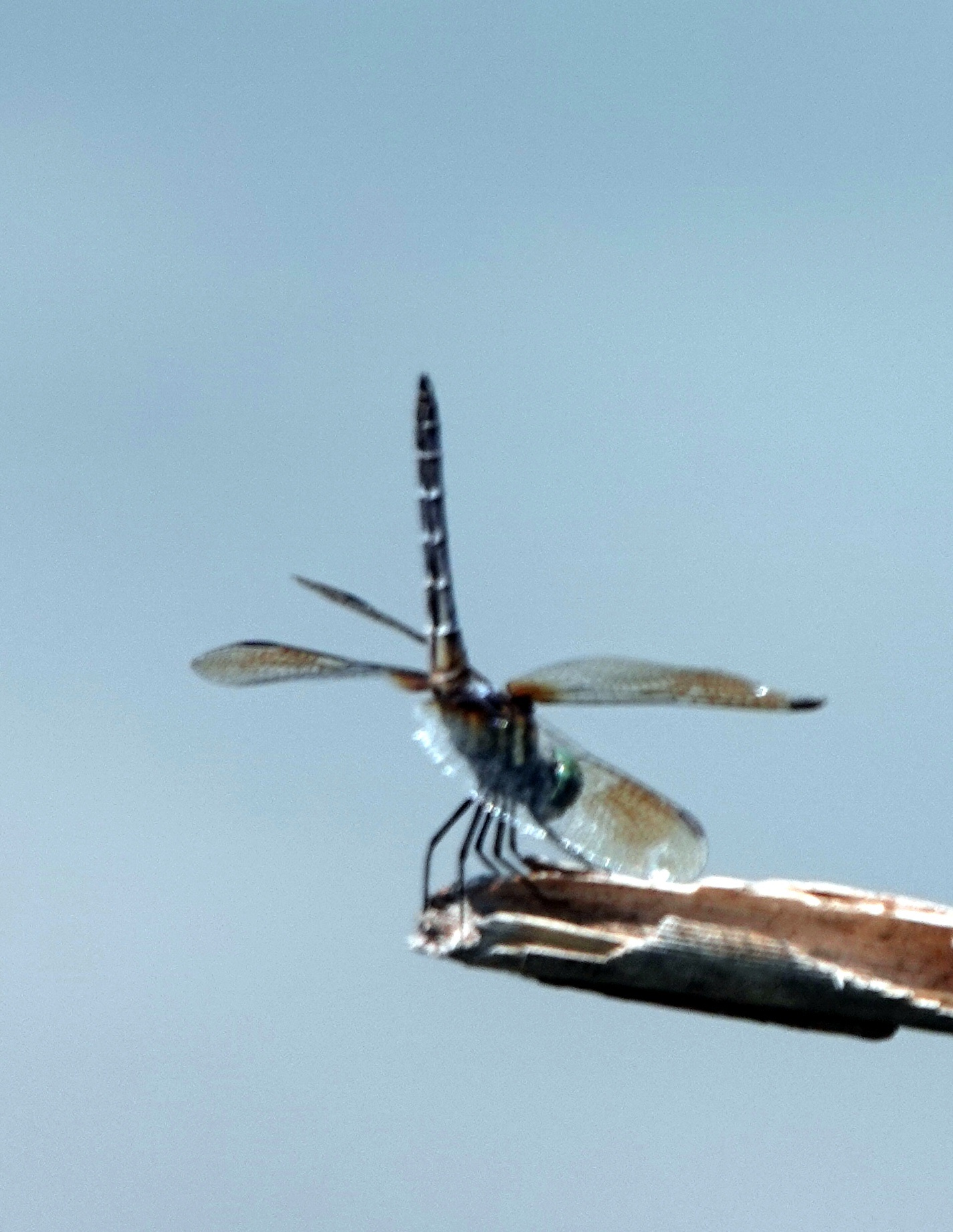 The blue dasher hunts by keeping still and waiting for suitable prey to come within range. When it does, they dart from their position to catch it.[10]